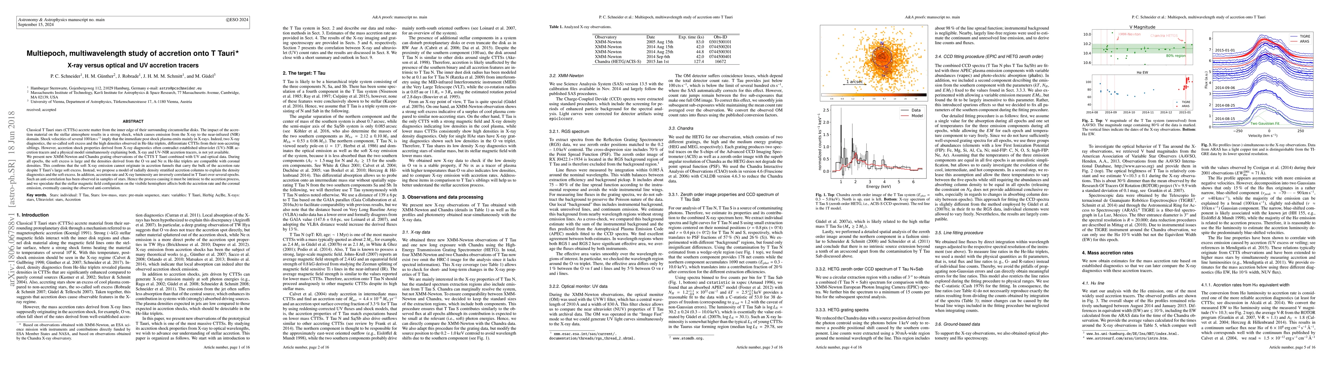 This paper presents a multiepoch, multiwavelength study of the T Tauri star, comparing X-ray diagnostics with optical and UV accretion tracers. The study finds a model of radially density stratified accretion columns better explains the observed soft X-ray emission and high densities, while an inverse correlation between accretion rate and X-ray luminosity suggests intrinsic magnetic field effects on the accretion process.