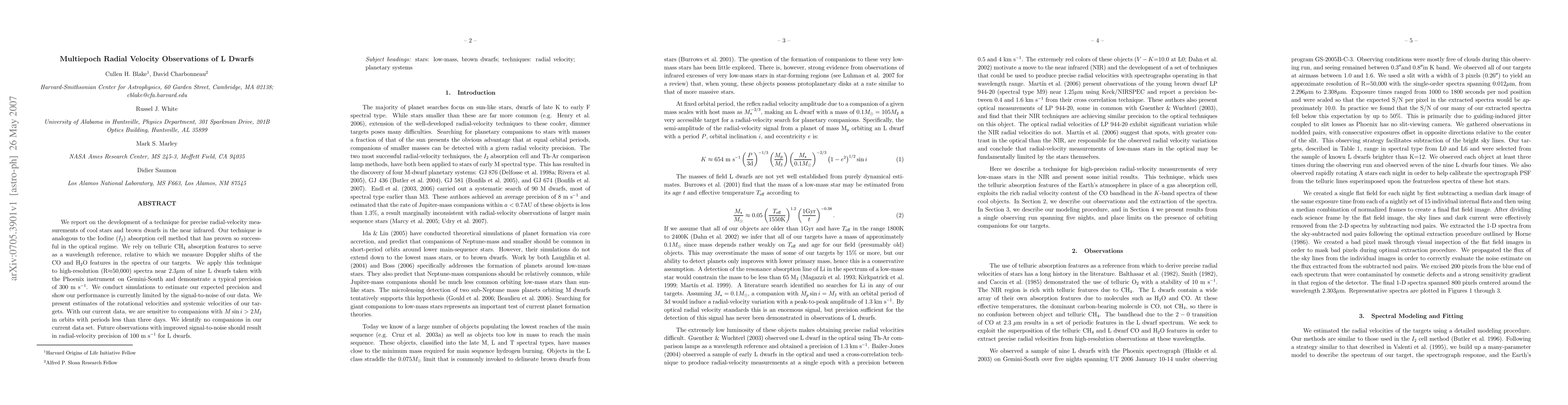 This paper develops a new technique for precise radial-velocity measurements of L dwarfs using near-infrared spectroscopy, achieving a typical precision of 300 m/s. The method leverages telluric CH4 absorption features for wavelength reference and identifies no companions in the current dataset.