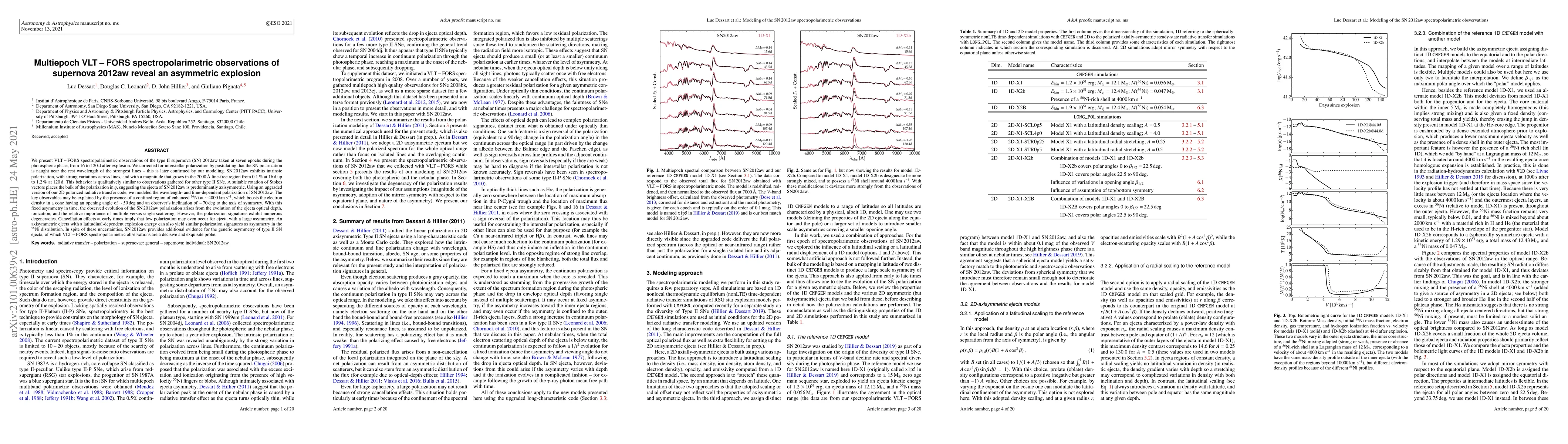 We present VLT-FORS spectropolarimetric observations of the type II supernova (SN) 2012aw taken at seven epochs during the photospheric phase, from 16 to 120d after explosion. We correct for the interstellar polarization by postulating that the SN polarization is naught near the rest wavelength of the strongest lines - this is later confirmed by our modeling. SN2012aw exhibits intrinsic polarization, with strong variations across lines, and with a magnitude that grows in the 7000A line-free region from 0.1% at 16d up to 1.2% at 120d. This behavior is qualitatively similar to observations gathered for other type II SNe. A suitable rotation of Stokes vectors places the bulk of the polarization in q, suggesting the ejecta of SN2012aw is predominantly axisymmetric. Using an upgraded version of our 2D polarized radiative transfer code, we model the wavelength- and time-dependent polarization of SN2012aw. The key observables may be explained by the presence of a confined region of enhanced 56Ni at ~4000km/s, which boosts the electron density in a cone having an opening angle of ~50deg and an observer's inclination of ~70deg to the axis of symmetry. With this fixed asymmetry in time, the observed evolution of the SN2012aw polarization arises from the evolution of the ejecta optical depth, ionization, and the relative importance of multiple versus single scattering. However, the polarization signatures exhibit numerous degeneracies. Cancellation effects at early times imply that a low polarization may occur for ejecta with a large asymmetry. An axisymmetric ejecta with a latitude-dependent explosion energy can also yield similar polarization signatures as an asymmetric 56Ni distribution. Despite these uncertainties, SN2012aw provides additional evidence for the generic asymmetry of type II SN ejecta, of which VLT-FORS spectropolarimetric observations are a decisive and exquisite probe.