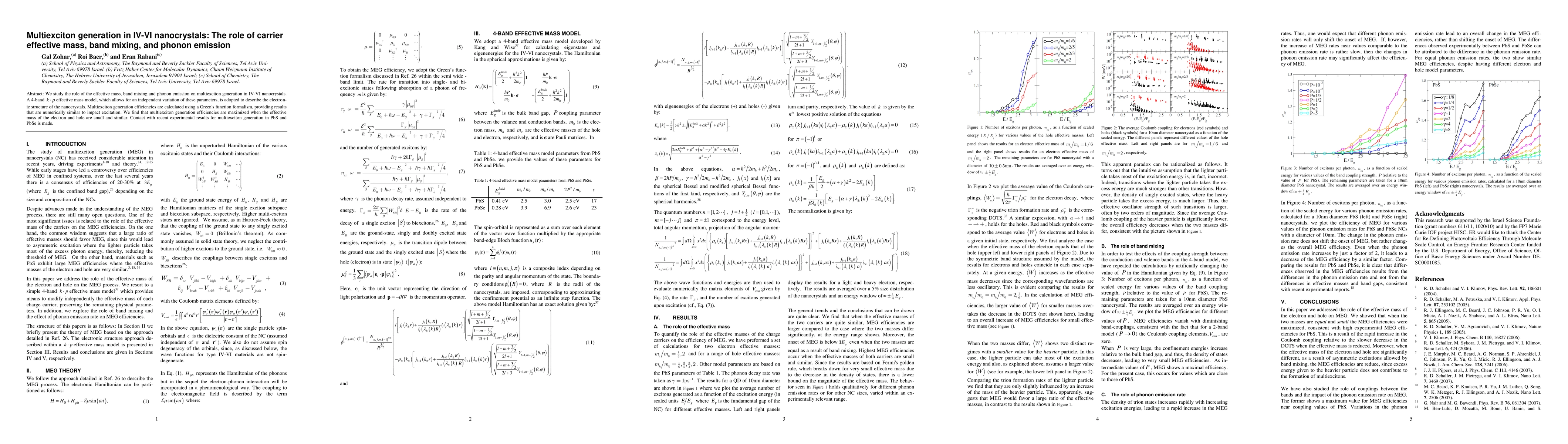 This paper investigates how effective mass, band mixing, and phonon emission influence multiexciton generation in IV-VI nanocrystals using a 4-band k·p model. Results show that optimal multiexciton generation occurs when electron and hole effective masses are small and comparable, aligning with recent experimental findings in PbS and PbSe.