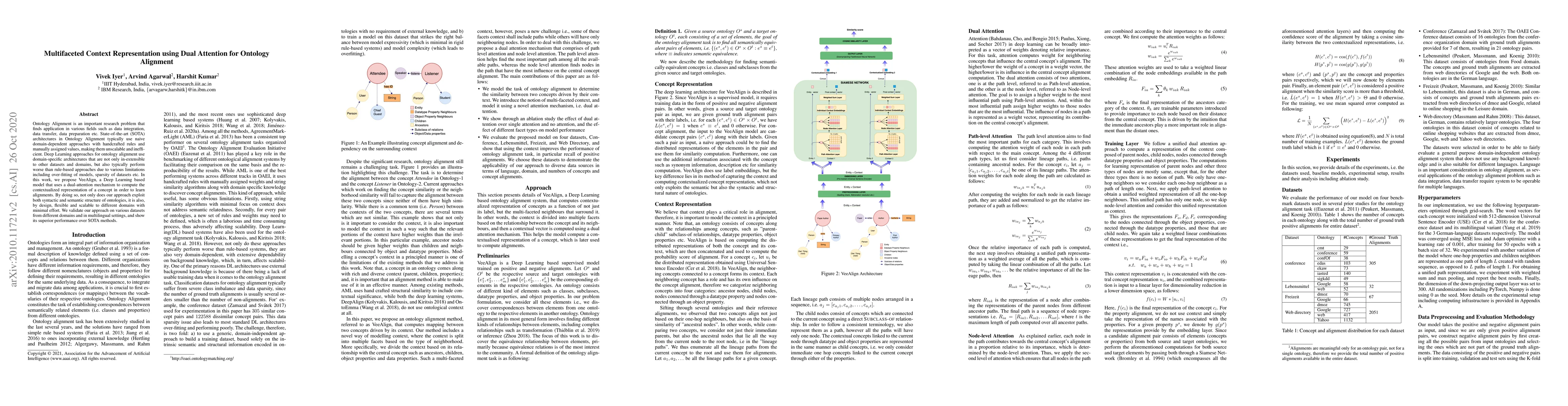 A new deep learning model, VeeAlign, uses dual attention to learn contextual representations for ontology alignment, outperforming state-of-the-art methods in various domains and languages.