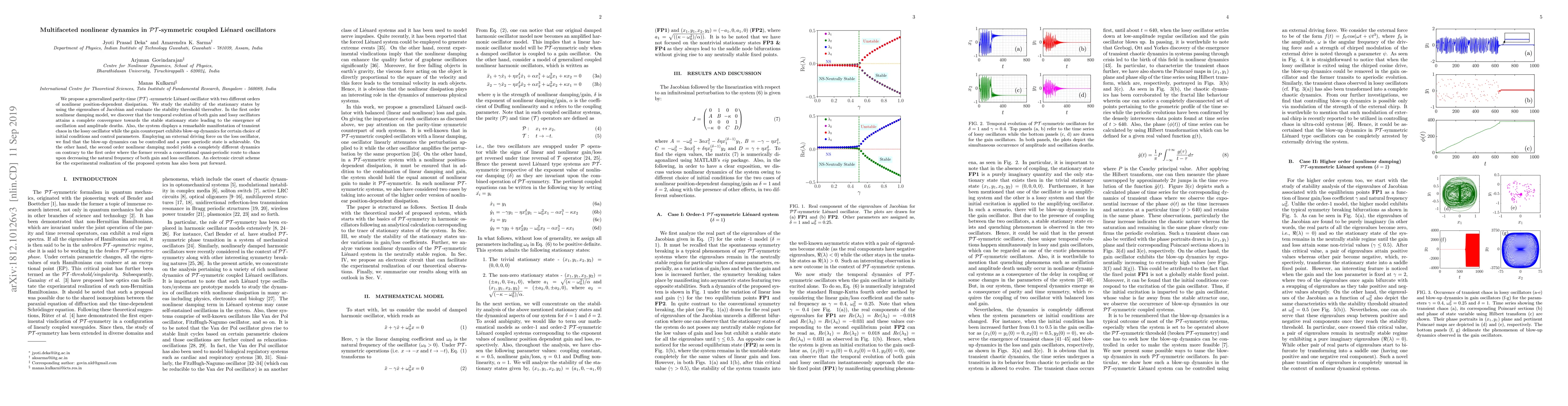 We propose a generalized parity-time ($\mathcal{PT}$) -symmetric Li\'enard oscillator with two different orders of nonlinear position-dependent dissipation. We study the stability of the stationary states by using the eigenvalues of Jacobian and evaluate the stability threshold thereafter. In the first order nonlinear damping model, we discover that the temporal evolution of both gain and lossy oscillators attains a complete convergence towards the stable stationary state leading to the emergence of oscillation and amplitude deaths. Also, the system displays a remarkable manifestation of transient chaos in the lossy oscillator while the gain counterpart exhibits blow-up dynamics for certain choice of initial conditions and control parameters. Employing an external driving force on the loss oscillator, we find that the blow-up dynamics can be controlled and a pure aperiodic state is achievable. On the other hand, the second order nonlinear damping model yields a completely different dynamics on contrary to the first order where the former reveals a conventional quasi-periodic route to chaos upon decreasing the natural frequency of both gain and loss oscillators. An electronic circuit scheme for the experimental realization of the proposed system has also been put forward.