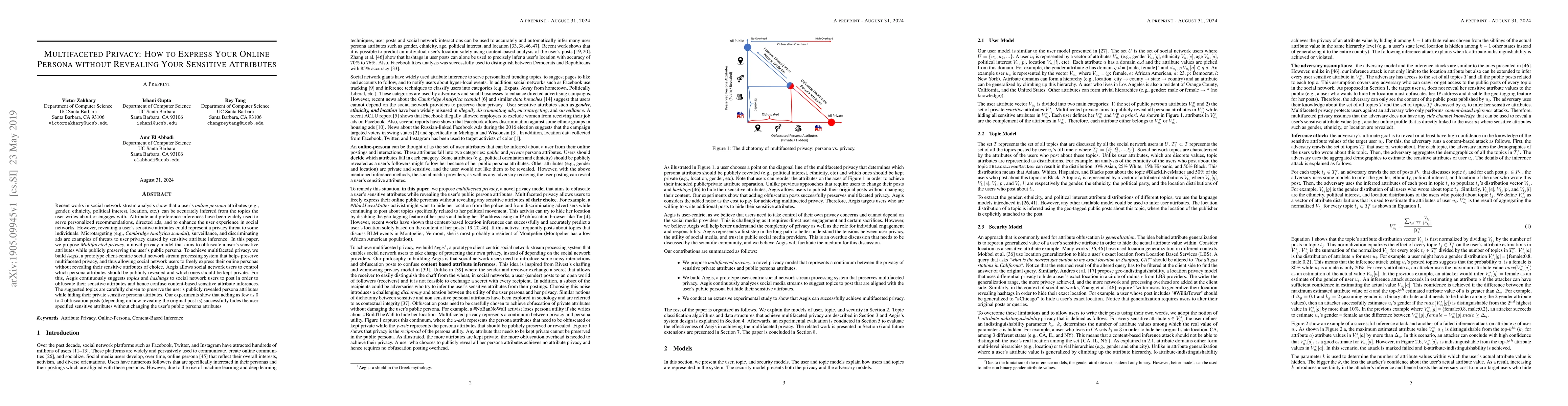 Researchers propose Multifaceted privacy to help users express their online persona without revealing sensitive attributes, using a new system called Aegis that suggests topics to obfuscate private info while preserving public persona.