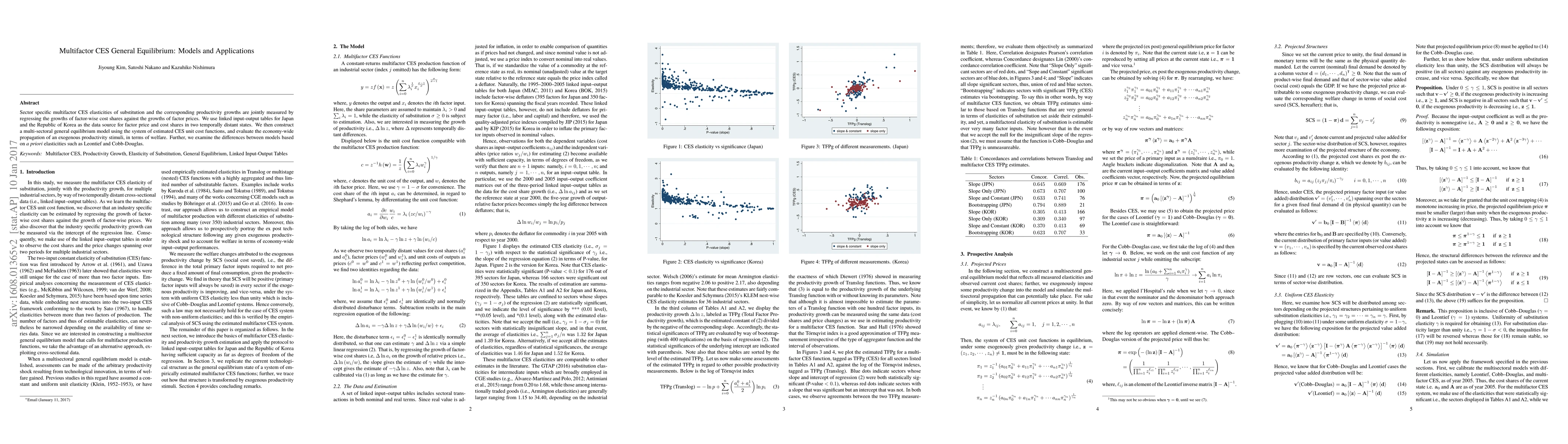 Sector specific multifactor CES elasticity of substitution and the corresponding productivity growths are jointly measured by regressing the growths of factor-wise cost shares against the growths of factor prices. We use linked input-output tables for Japan and the Republic of Korea as the data source for factor price and cost shares in two temporally distant states. We then construct a multi-sectoral general equilibrium model using the system of estimated CES unit cost functions, and evaluate the economy-wide propagation of an exogenous productivity stimuli, in terms of welfare. Further, we examine the differences between models based on a priori elasticity such as Leontief and Cobb-Douglas.