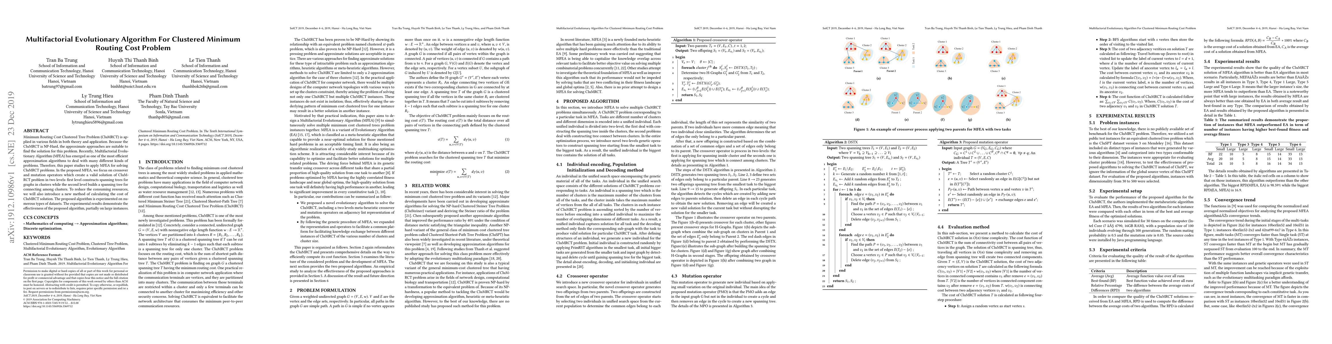 This paper proposes a Multifactorial Evolutionary Algorithm (MFEA) to solve the Minimum Routing Cost Clustered Tree Problem (CluMRCT), which is an NP-Hard issue. The MFEA focuses on specialized crossover and mutation operators to construct spanning trees at two levels, optimizing resource consumption and solution cost. Experimental results show the algorithm's effectiveness, especially for large datasets.