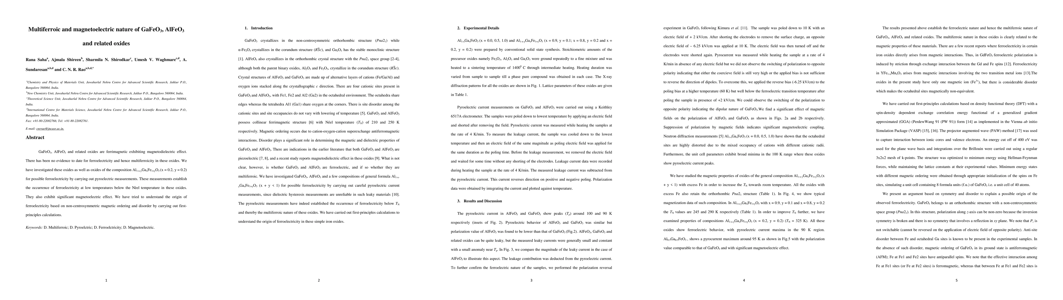 The paper presents a detailed investigation of ferroelectricity and magnetoelectric properties in GaFeO3, AlFeO3, and related oxides using pyroelectric measurements and first-principles calculations, providing insights into the origin of ferroelectricity in these materials.