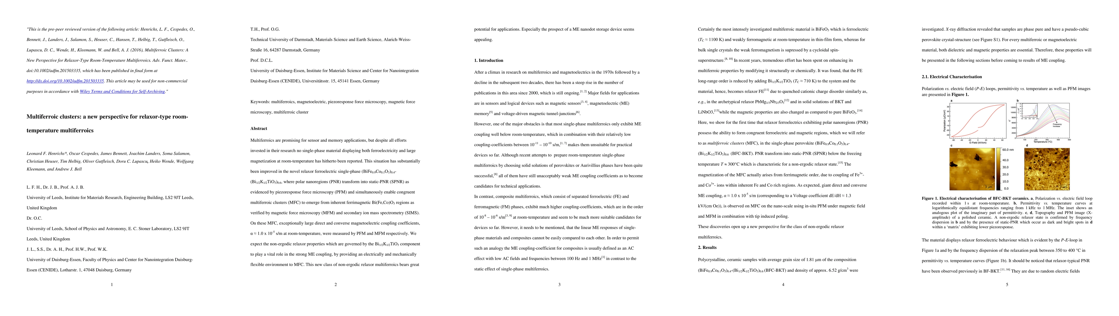 This paper introduces a novel relaxor ferroelectric material that exhibits both ferroelectricity and large magnetization at room temperature through the formation of multiferroic clusters. These clusters, enabled by ferrimagnetic Bi(Fe,Co)O3 regions, show strong magnetoelectric coupling, promising potential for sensor and memory applications, particularly for magnetoelectric nanodot storage devices.