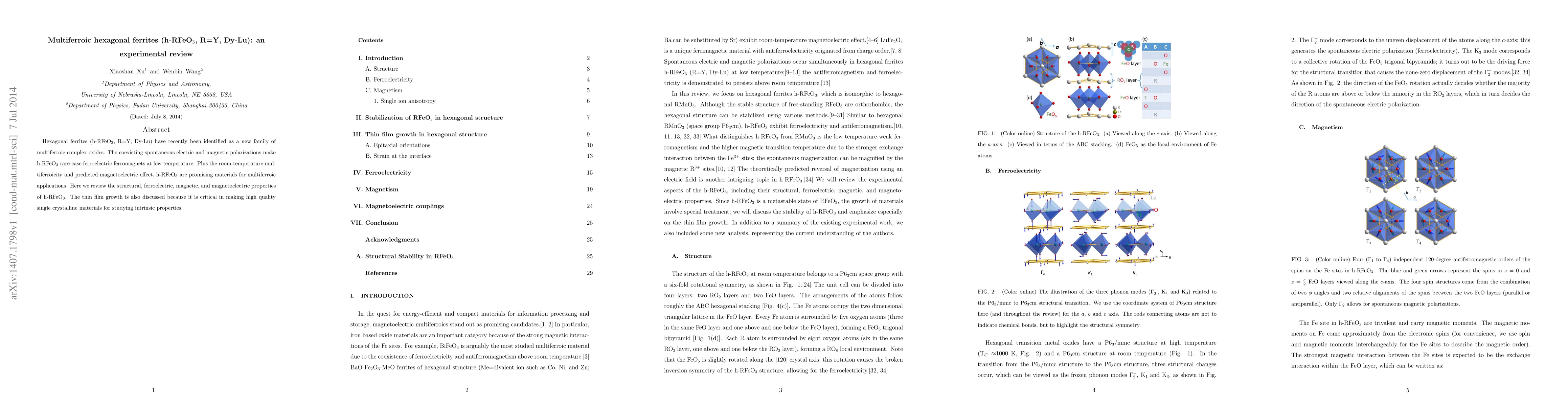This paper reviews the structural, ferroelectric, magnetic, and magnetoelectric properties of hexagonal ferrites (h-RFeO$_3$, R=Y, Dy-Lu), highlighting their potential as multiferroic materials due to their coexistence of spontaneous electric and magnetic polarizations, especially at low temperatures. The paper also discusses the importance of thin film growth for high-quality single crystalline materials.