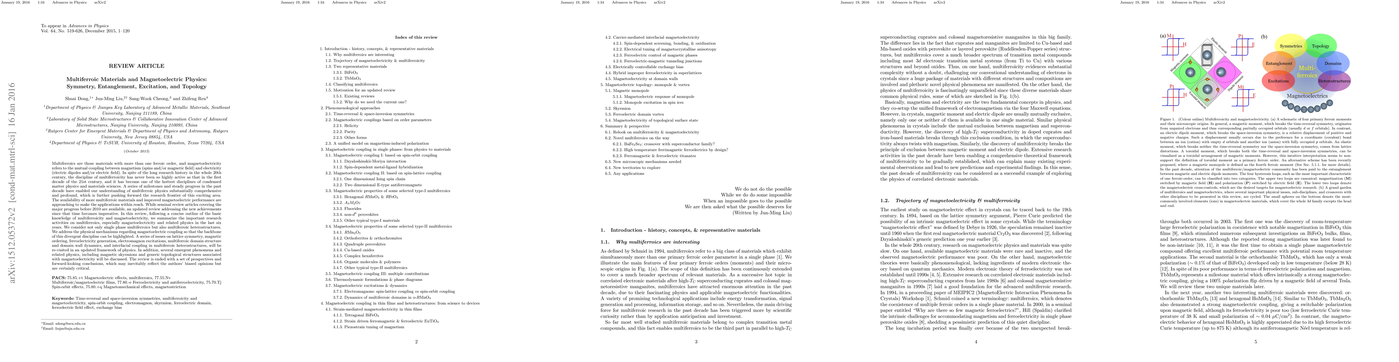 This paper reviews recent advances in multiferroic materials and magnetoelectric physics, focusing on symmetry, entanglement, excitation, and topological phenomena. It covers new developments in multiferroic heterostructures, mechanisms of magnetoelectric coupling, and emergent phenomena like magnetic skyrmions, providing a comprehensive update on the field since 2010.
