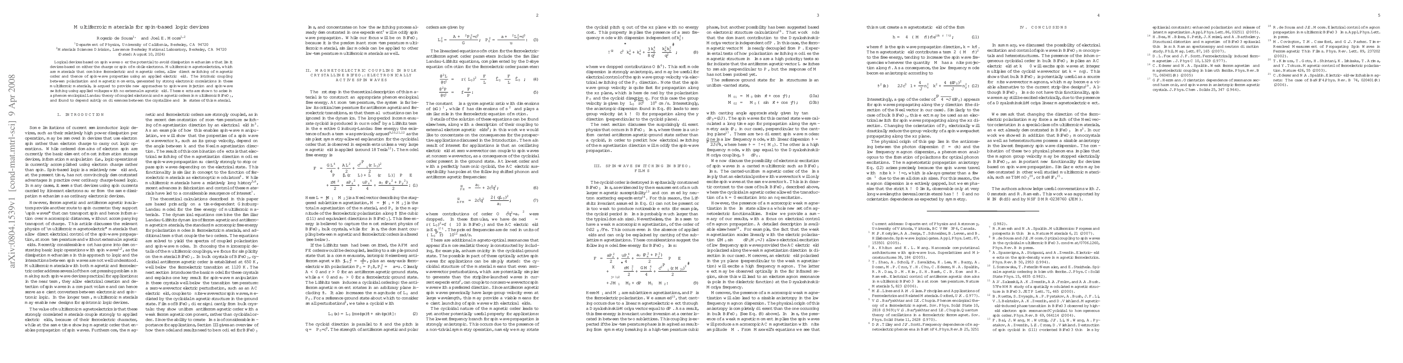 This paper explores the potential of multiferroic materials for spin-based logic devices, leveraging their magnetoelectric properties to switch magnetic order and spin-wave properties via electric fields. The study uses a Landau theory to demonstrate these effects in multiferroic BiFeO3, highlighting the material's unique coupling between polarization and magnetic moments.