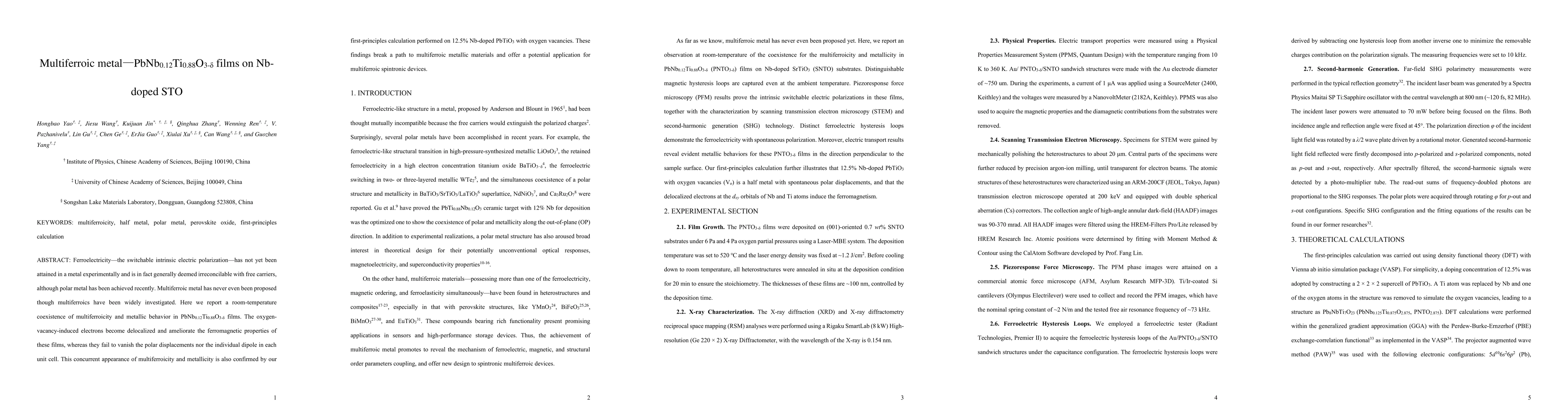 Ferroelectricity-the switchable intrinsic electric polarization-has not yet been attained in a metal experimentally and is in fact generally deemed irreconcilable with free carriers, although polar metal has been achieved recently. Multiferroic metal has never even been proposed though multiferroics have been widely investigated. Here we report a room-temperature coexistence of multiferroicity and metallic behavior in PbNb0.12Ti0.88O3-delta films. The oxygen-vacancy-induced electrons become delocalized and ameliorate the ferromagnetic properties of these films, whereas they fail to vanish the polar displacements nor the individual dipole in each unit cell. This concurrent appearance of multiferroicity and metallicity is also confirmed by our first-principles calculation performed on 12.5% Nb-doped PbTiO3 with oxygen vacancies. These findings break a path to multiferroic metallic materials and offer a potential application for multiferroic spintronic devices.