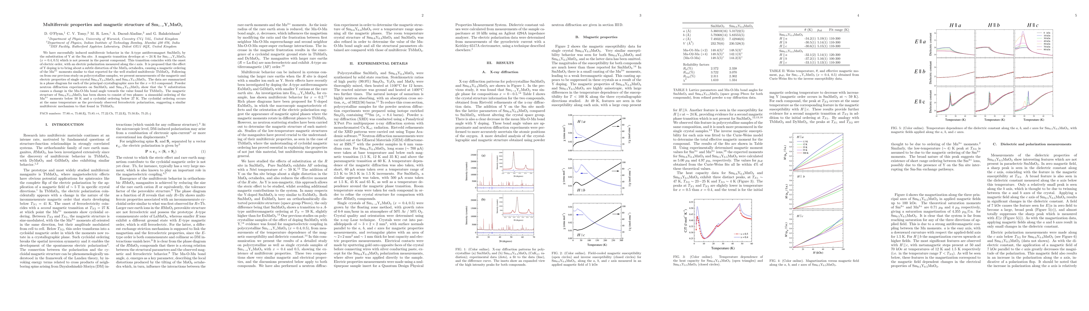 This study demonstrates the induction of multiferroic behavior in SmMnO3 through Y doping, resulting in a magnetic transition at 24 K accompanied by electric polarization. Neutron diffraction and magnetic structure analysis reveal a change in the Mn-O-Mn bond angle and complex magnetic ordering phases, akin to TbMnO3, indicating a similar multiferroic mechanism.