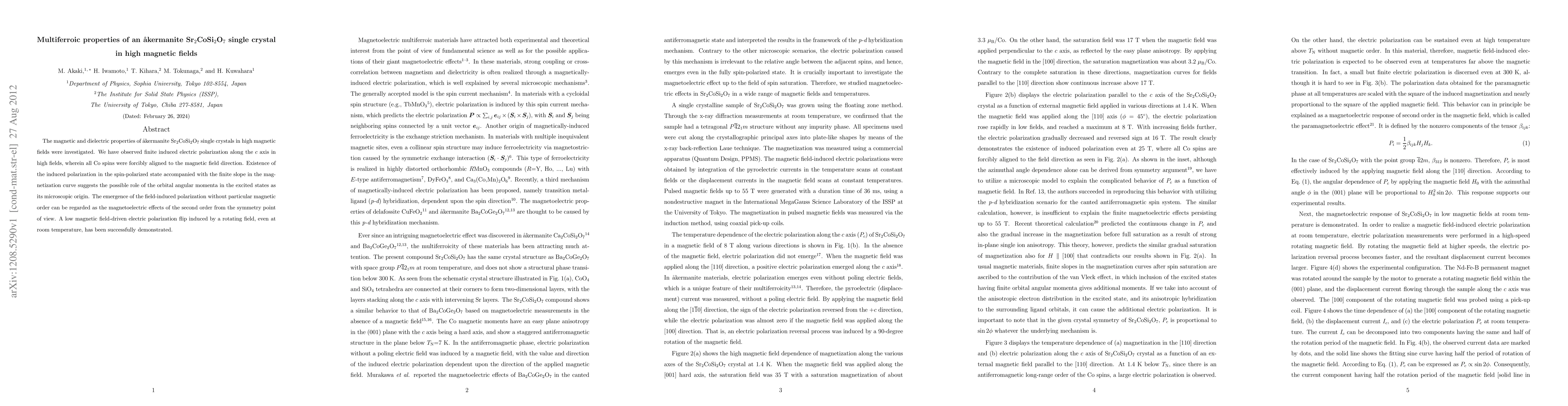 The magnetic and dielectric properties of \aa kermanite Sr$_2$CoSi$_2$O$_7$ single crystals in high magnetic fields were investigated. We have observed finite induced electric polarization along the c axis in high fields, wherein all Co spins were forcibly aligned to the magnetic field direction. Existence of the induced polarization in the spin-polarized state accompanied with the finite slope in the magnetization curve suggests the possible role of the orbital angular momenta in the excited states as its microscopic origin. The emergence of the field-induced polarization without particular magnetic order can be regarded as the magnetoelectric effects of the second order from the symmetry point of view. A low magnetic field-driven electric polarization flip induced by a rotating field, even at room temperature, has been successfully demonstrated.