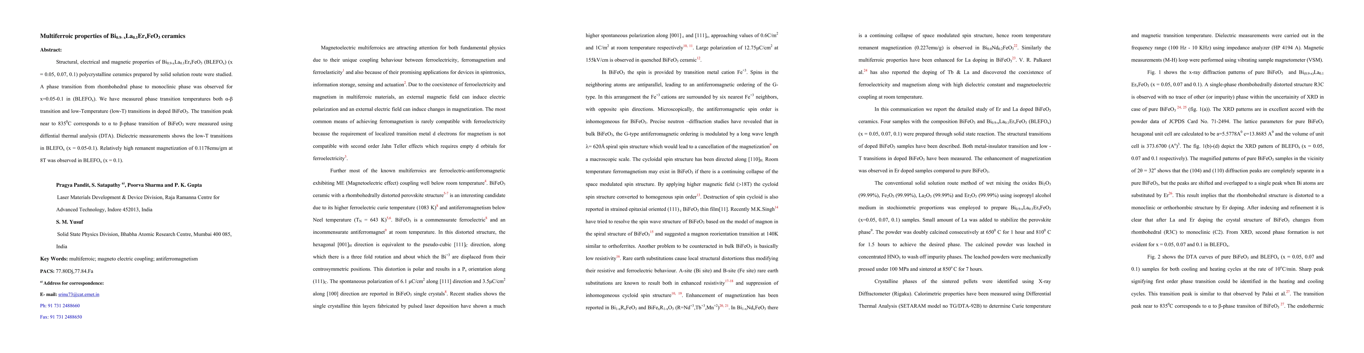 Structural, electrical and magnetic properties of Bi0.9-xLa0.1ErxFeO3 (BLEFOx) (x = 0.05, 0.07, 0.1) polycrystalline ceramics prepared by solid solution route were studied. A phase transition from rhombohedral phase to monoclinic phase was observed for x=0.05-0.1 in (BLEFOx). We have measured phase transition temperatures both alpha-beta transition and low-Temperature (low-T) transitions in doped BiFeO3. The transition peak near to 835C corresponds to alpha to beta-phase transition of BiFeO3 were measured using diffential thermal analysis (DTA). Dielectric measurements shows the low-T transitions in BLEFOx (x = 0.05-0.1). Relatively high remanent magnetization of 0.1178emu/gm at 8T was observed in BLEFOx (x = 0.1).