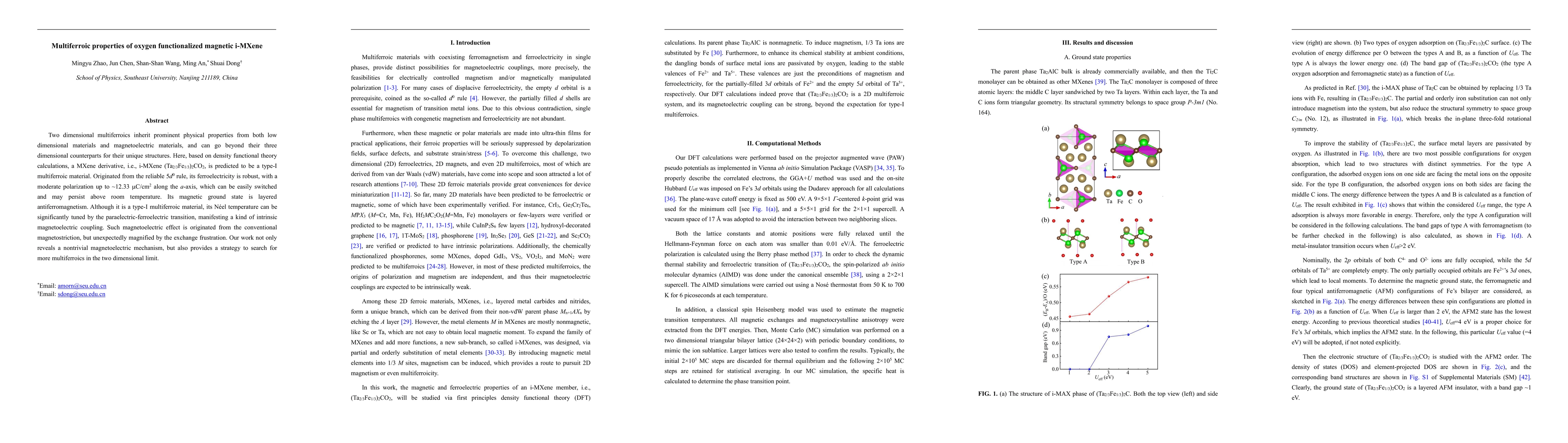 This paper predicts that oxygen functionalized i-MXene (Ta$_{2/3}$Fe$_{1/3}$)$_2$CO$_2$ exhibits type-I multiferroic properties, with robust ferroelectricity and tunable antiferromagnetic ground state. The study reveals an intrinsic magnetoelectric coupling mechanism, offering a strategy for discovering more two-dimensional multiferroic materials.