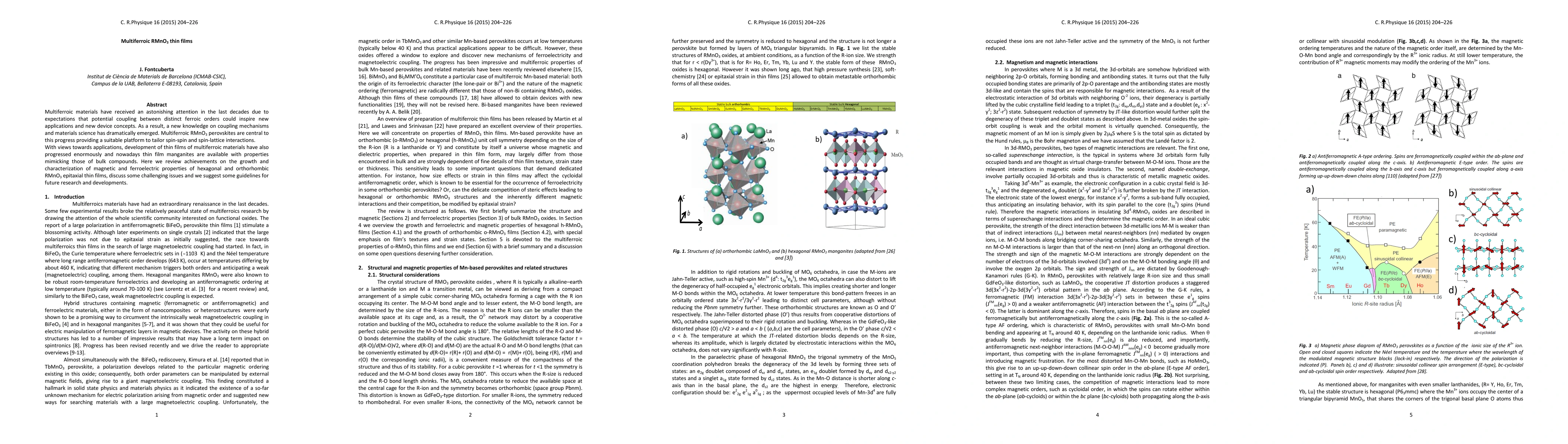 This paper reviews advancements in the growth and characterization of RMnO3 thin films, highlighting their magnetic and ferroelectric properties, and discusses challenges and future research directions in the development of these multiferroic materials for potential applications.