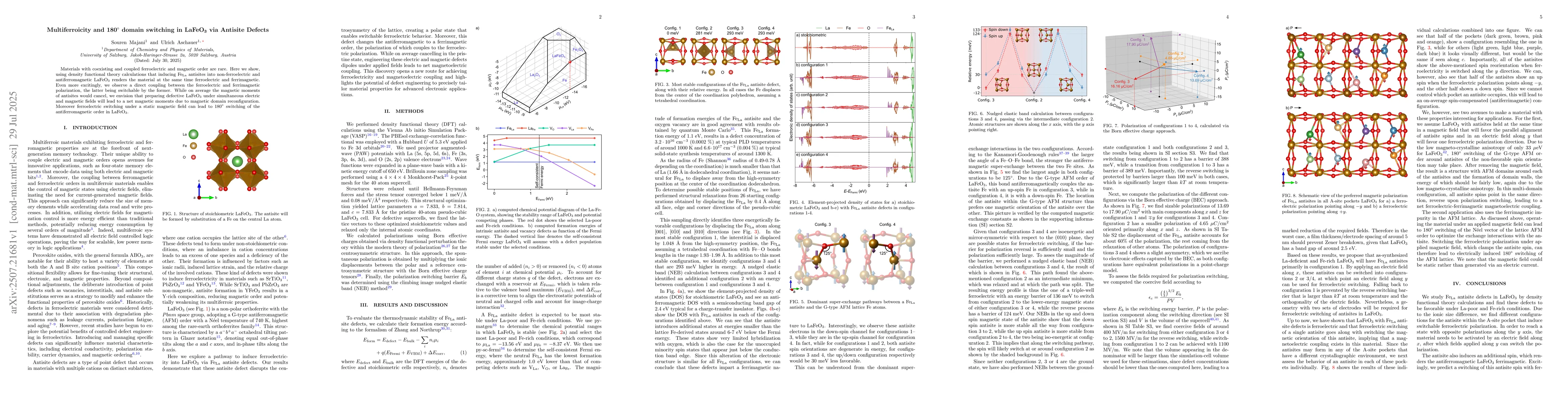 The novelty of this work lies in proposing a strategy to induce multiferroicity in a non-inherent ferroelectric material, LaFeO3, by introducing FeLa antisite defects, and predicting the switchable 180° magnetic domain reconfiguration under electric field control.