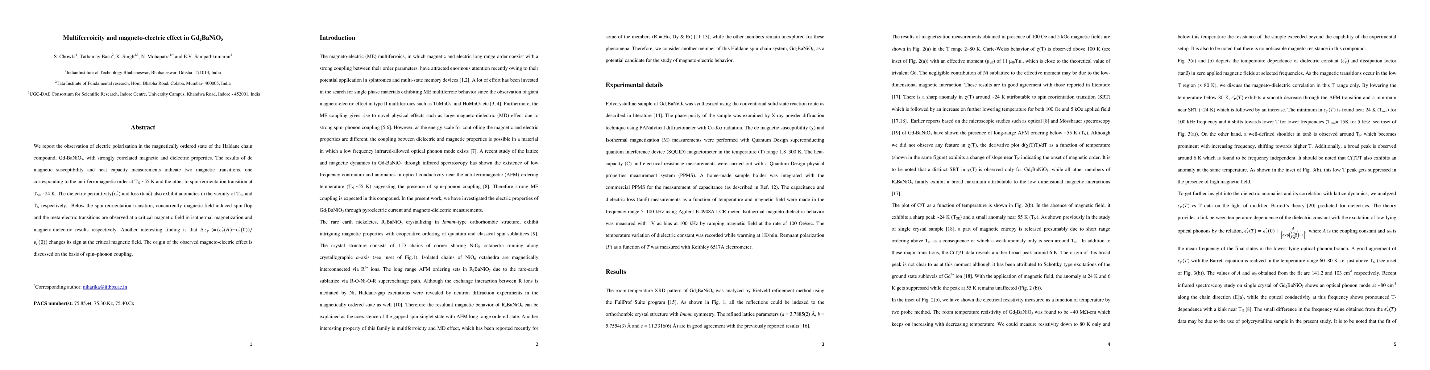 We report the observation of electric polarization in the magnetically ordered state of the Haldane chain compound, Gd$_2$BaNiO$_5$, with strongly correlated magnetic and dielectric properties. The results of dc magnetic susceptibility and heat capacity measurements indicate two magnetic transitions,one corresponding to the anti-ferromagnetic order at T$_N$ around 55 K and the other to spin-reorientation transition at T$_{SR}$ around 24 K. The dielectric permittivity ($\epsilon'$) and loss (tan$\delta$) also exhibit anomalies in the vicinity of T$_{SR}$ and T$_N$ respectively. Below the spin-reorientation transition, concurrently magnetic-field-induced spin-flop and the meta-electric transitions are observed at a critical magnetic field in isothermal magnetization and magneto-dielectric results respectively. Another interesting finding is that the change in dielectric constant changes its sign at the critical magnetic field. The origin of the observed magneto-electric effect is discussed on the basis of spin-phonon coupling.