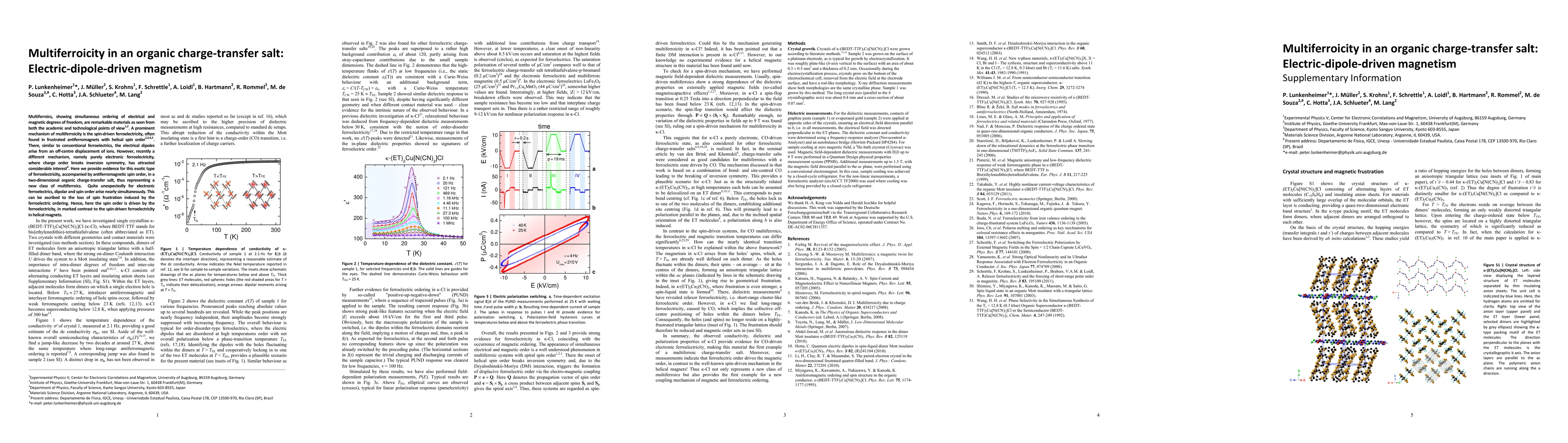 This paper reports on a new class of multiferroics in an organic charge-transfer salt where ferroelectricity driven by electronic charge order induces antiferromagnetic spin order, contrasting with traditional spin-driven ferroelectricity. The simultaneous emergence of dipolar and spin order is attributed to the reduction of spin frustration via ferroelectric ordering.