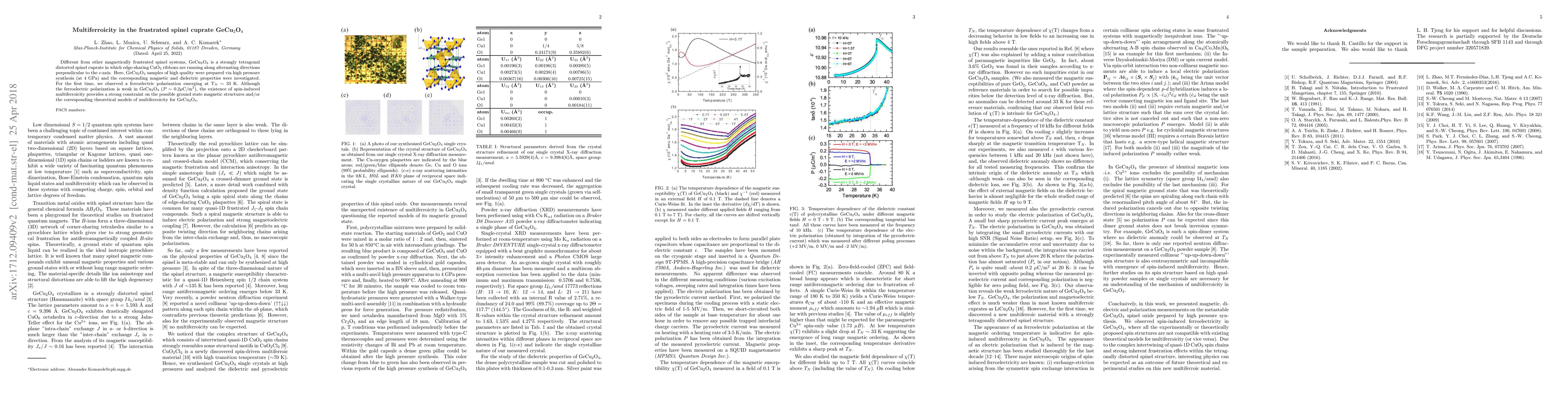 GeCu$_{2}$O$_{4}$ exhibits multiferroicity due to spin-induced ferroelectric polarization at $\sim$33 K, despite weak polarization. High-pressure synthesis enhances sample quality, revealing constraints on magnetic structures and theoretical models for this phenomenon.