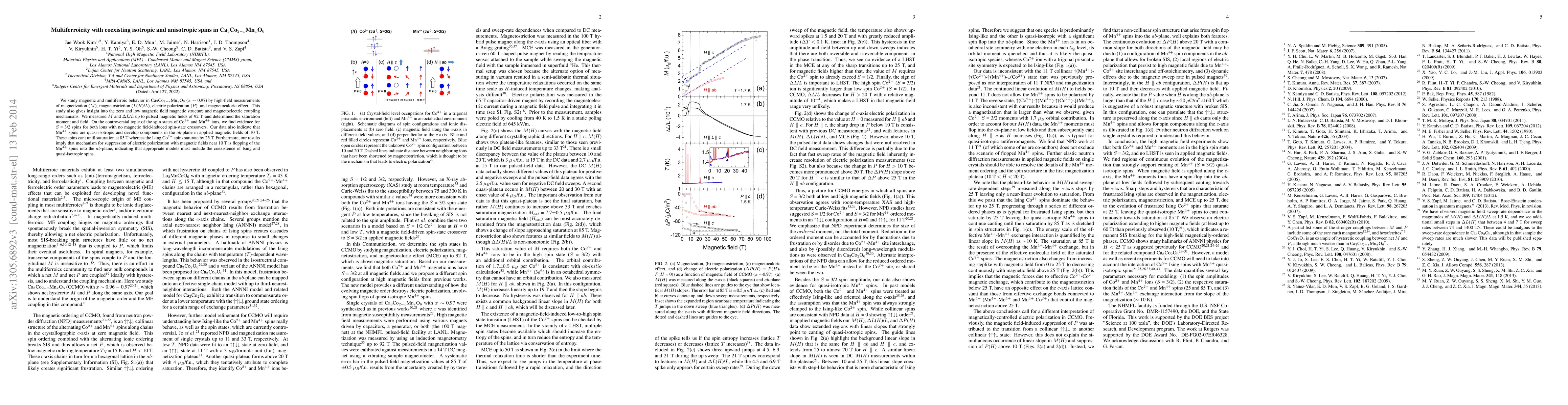 We study magnetic and multiferroic behavior in Ca$_3$Co$_{2-x}$Mn$_{x}$O$_6$ ($x \sim$0.97) by high-field measurements of magnetization ($M$), magnetostriction ($L$($H$)/$L$), electric polarization ($P$), and magnetocaloric effect. This study also gives insight into the zero and low magnetic field magnetic structure and magnetoelectric coupling mechanisms. We measured $M$ and $\Delta$$L$/$L$ up to pulsed magnetic fields of 92 T, and determined the saturation moment and field. On the controversial topic of the spin states of Co$^{2+}$ and Mn$^{4+}$ ions, we find evidence for $S$ = 3/2 spins for both ions with no magnetic field-induced spin-state crossovers. Our data also indicate that Mn$^{4+}$ spins are quasi-isotropic and develop components in the $ab$-plane in applied magnetic fields of 10 T. These spins cant until saturation at 85 T whereas the Ising Co$^{2+}$ spins saturate by 25 T. Furthermore, our results imply that mechanism for suppression of electric polarization with magnetic fields near 10 T is flopping of the Mn$^{4+}$ spins into the $ab$-plane, indicating that appropriate models must include the coexistence of Ising and quasi-isotropic spins.