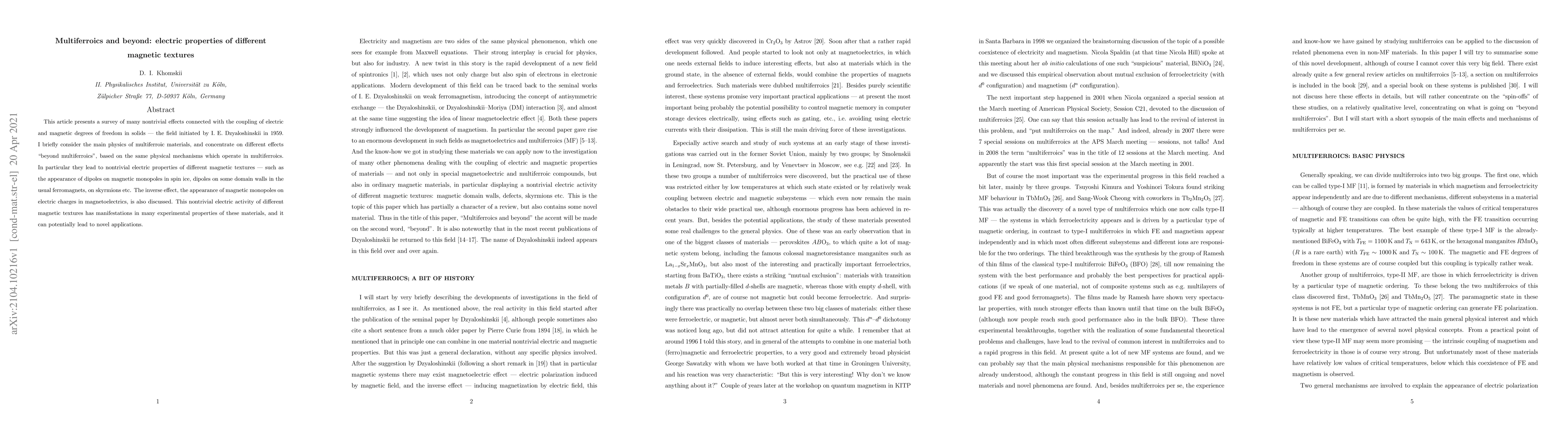 This article presents a survey of many nontrivial effects connected with the coupling of electric and magnetic degrees of freedom in solids -- the field initiated by I.~E.~Dzyaloshinskii in 1959. I briefly consider the main physics of ultiferroic materials, and concentrate on different effects "beyond multiferroics", based on the same physical mechanisms which operate in multiferroics. In particular they lead to nontrivial electric properties of different magnetic textures -- such as the appearance of dipoles on magnetic monopoles in spin ice, dipoles on some domain walls in the usual ferromagnets, on skyrmions etc. The inverse effect, the appearance of magnetic monopoles on electric charges in magnetoelectrics, is also discussed. This nontrivial electric activity of different magnetic textures has manifestations in many experimental properties of these materials, and it can potentially lead to novel applications.