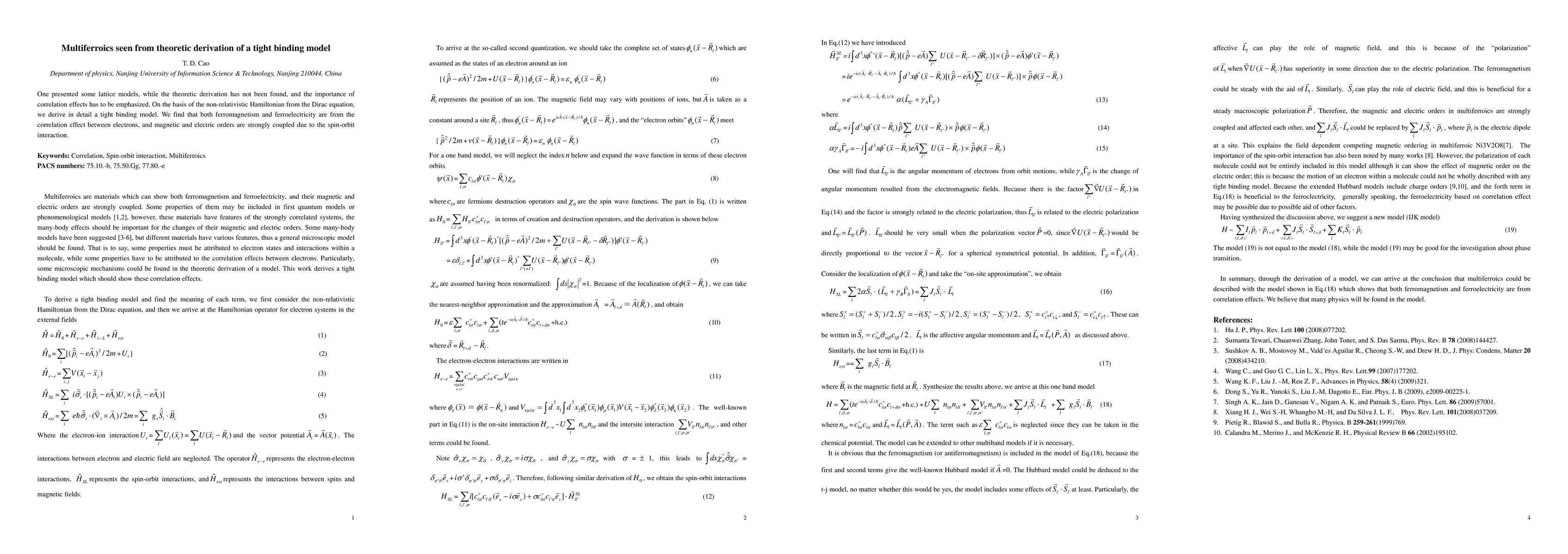 One presented some lattice models, while the theoretic derivation has not been found, and the importance of correlation effects has to be emphasized. On the basis of the non-relativistic Hamiltonian from the Dirac equation, we derive in detail a tight binding model. We find that both ferromagnetism and ferroelectricity are from the correlation effect between electrons, and magnetic and electric orders are strongly coupled due to the spin-orbit interaction.