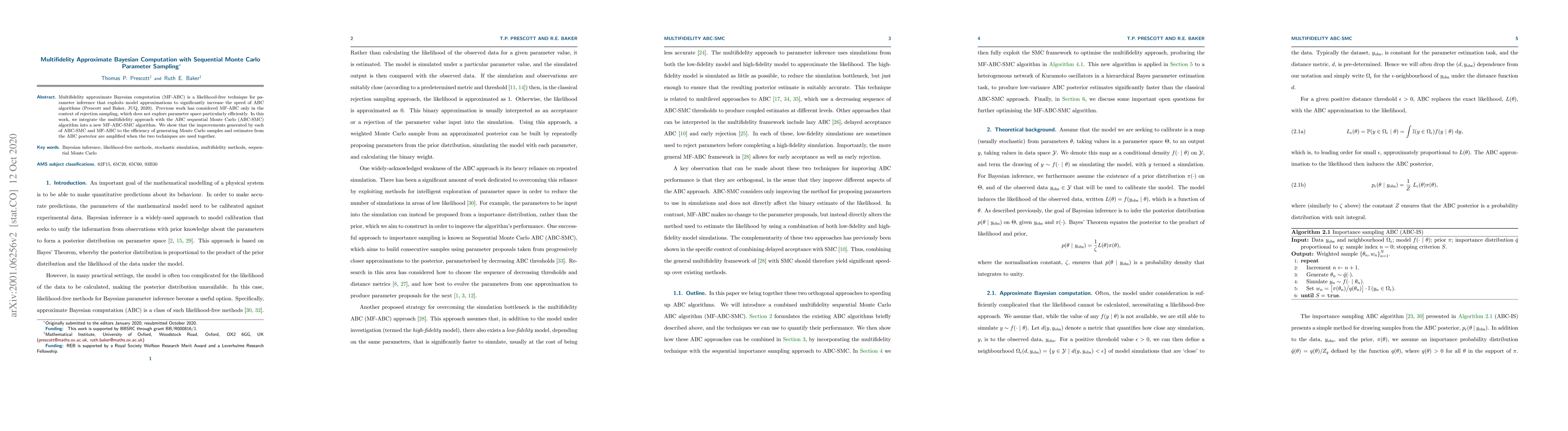 This paper introduces a new MF-ABC-SMC algorithm that combines multifidelity approximate Bayesian computation with the ABC sequential Monte Carlo method to improve parameter inference efficiency. The integration of these techniques amplifies the benefits of both, enhancing the speed and accuracy of generating Monte Carlo samples and posterior estimates.