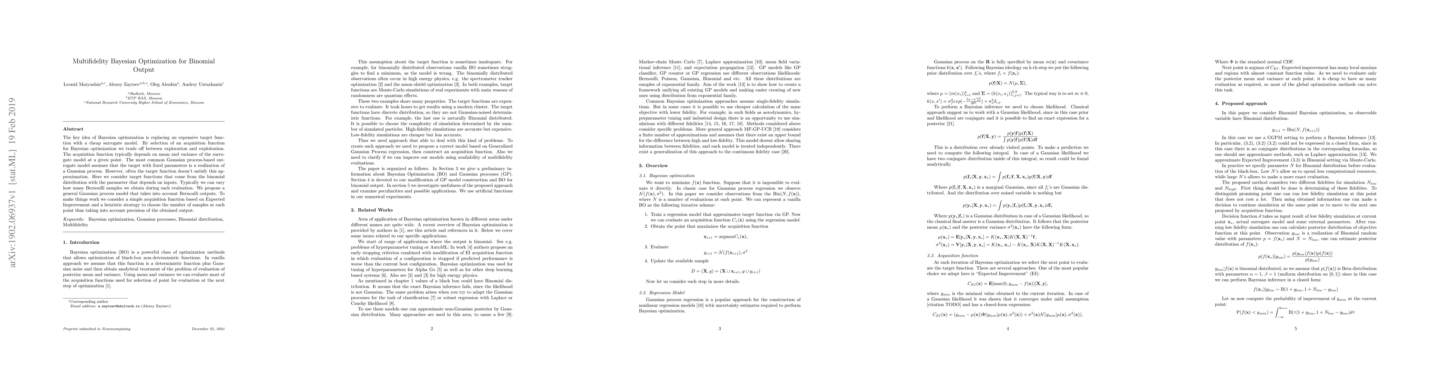 The key idea of Bayesian optimization is replacing an expensive target function with a cheap surrogate model. By selection of an acquisition function for Bayesian optimization, we trade off between exploration and exploitation. The acquisition function typically depends on the mean and the variance of the surrogate model at a given point. The most common Gaussian process-based surrogate model assumes that the target with fixed parameters is a realization of a Gaussian process. However, often the target function doesn't satisfy this approximation. Here we consider target functions that come from the binomial distribution with the parameter that depends on inputs. Typically we can vary how many Bernoulli samples we obtain during each evaluation. We propose a general Gaussian process model that takes into account Bernoulli outputs. To make things work we consider a simple acquisition function based on Expected Improvement and a heuristic strategy to choose the number of samples at each point thus taking into account precision of the obtained output.