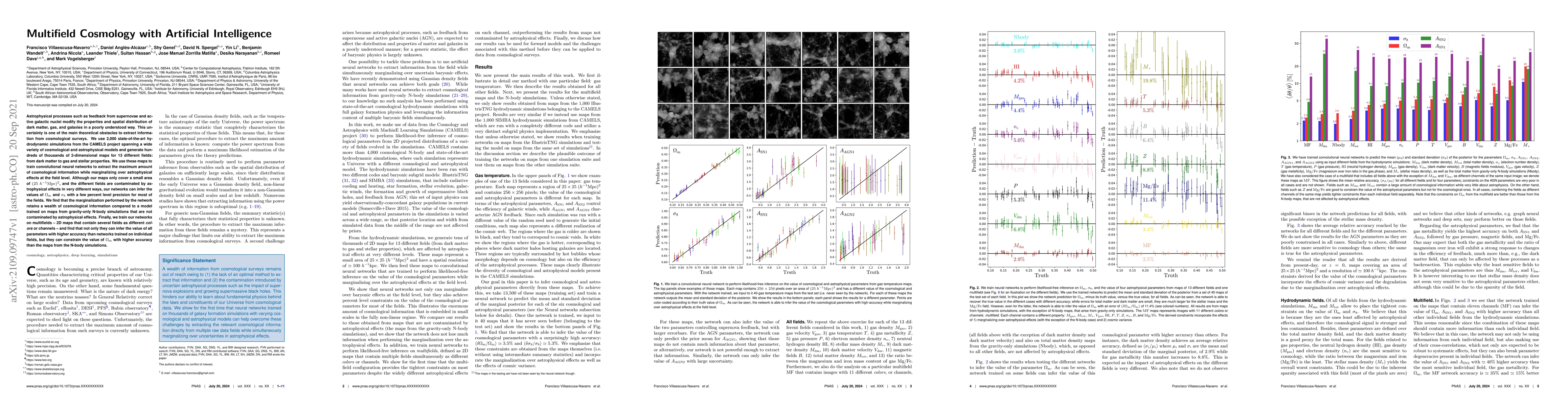 Astrophysical processes such as feedback from supernovae and active galactic nuclei modify the properties and spatial distribution of dark matter, gas, and galaxies in a poorly understood way. This uncertainty is one of the main theoretical obstacles to extract information from cosmological surveys. We use 2,000 state-of-the-art hydrodynamic simulations from the CAMELS project spanning a wide variety of cosmological and astrophysical models and generate hundreds of thousands of 2-dimensional maps for 13 different fields: from dark matter to gas and stellar properties. We use these maps to train convolutional neural networks to extract the maximum amount of cosmological information while marginalizing over astrophysical effects at the field level. Although our maps only cover a small area of $(25~h^{-1}{\rm Mpc})^2$, and the different fields are contaminated by astrophysical effects in very different ways, our networks can infer the values of $\Omega_{\rm m}$ and $\sigma_8$ with a few percent level precision for most of the fields. We find that the marginalization performed by the network retains a wealth of cosmological information compared to a model trained on maps from gravity-only N-body simulations that are not contaminated by astrophysical effects. Finally, we train our networks on multifields -- 2D maps that contain several fields as different colors or channels -- and find that not only they can infer the value of all parameters with higher accuracy than networks trained on individual fields, but they can constrain the value of $\Omega_{\rm m}$ with higher accuracy than the maps from the N-body simulations.