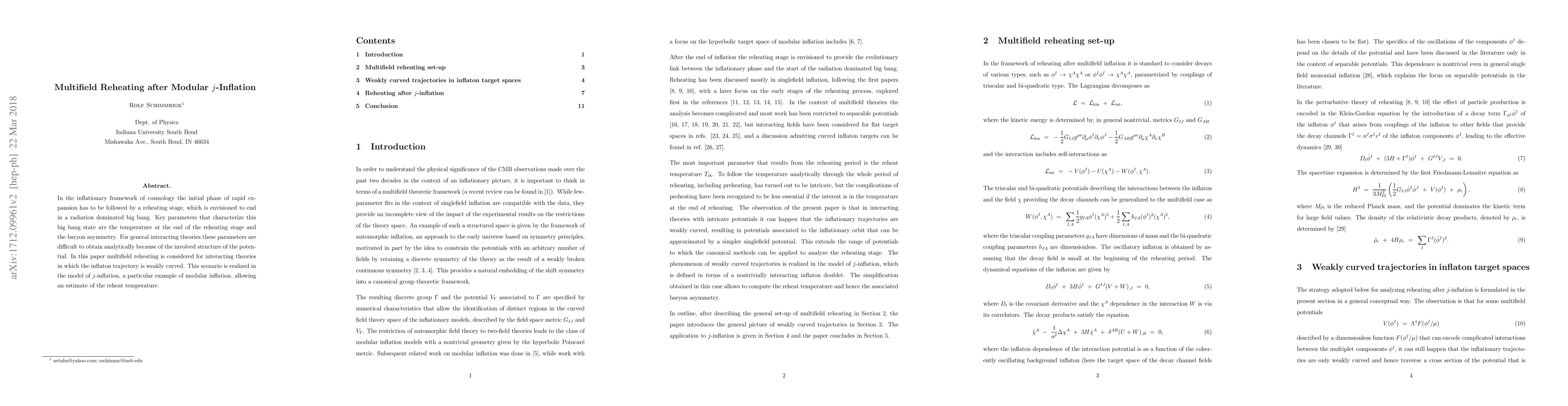 In the inflationary framework of cosmology the initial phase of rapid expansion has to be followed by a reheating stage, which is envisioned to end in a radiation dominated big bang. Key parameters that characterize this big bang state are the temperature at the end of the reheating stage and the baryon asymmetry. For general interacting theories these parameters are difficult to obtain analytically because of the involved structure of the potential. In this paper multifield reheating is considered for interacting theories in which the inflaton trajectory is weakly curved. This scenario is realized in the model of $j$-inflation, a particular example of modular inflation, allowing an estimate of the reheat temperature.