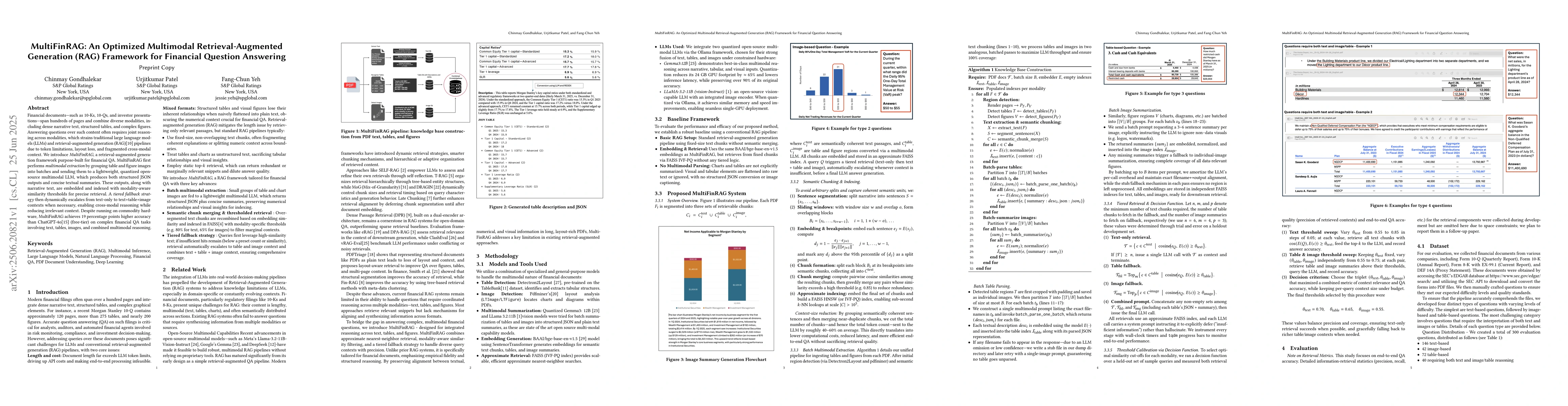 Financial documents--such as 10-Ks, 10-Qs, and investor presentations--span hundreds of pages and combine diverse modalities, including dense narrative text, structured tables, and complex figures. Answering questions over such content often requires joint reasoning across modalities, which strains traditional large language models (LLMs) and retrieval-augmented generation (RAG) pipelines due to token limitations, layout loss, and fragmented cross-modal context. We introduce MultiFinRAG, a retrieval-augmented generation framework purpose-built for financial QA. MultiFinRAG first performs multimodal extraction by grouping table and figure images into batches and sending them to a lightweight, quantized open-source multimodal LLM, which produces both structured JSON outputs and concise textual summaries. These outputs, along with narrative text, are embedded and indexed with modality-aware similarity thresholds for precise retrieval. A tiered fallback strategy then dynamically escalates from text-only to text+table+image contexts when necessary, enabling cross-modal reasoning while reducing irrelevant context. Despite running on commodity hardware, MultiFinRAG achieves 19 percentage points higher accuracy than ChatGPT-4o (free-tier) on complex financial QA tasks involving text, tables, images, and combined multimodal reasoning.