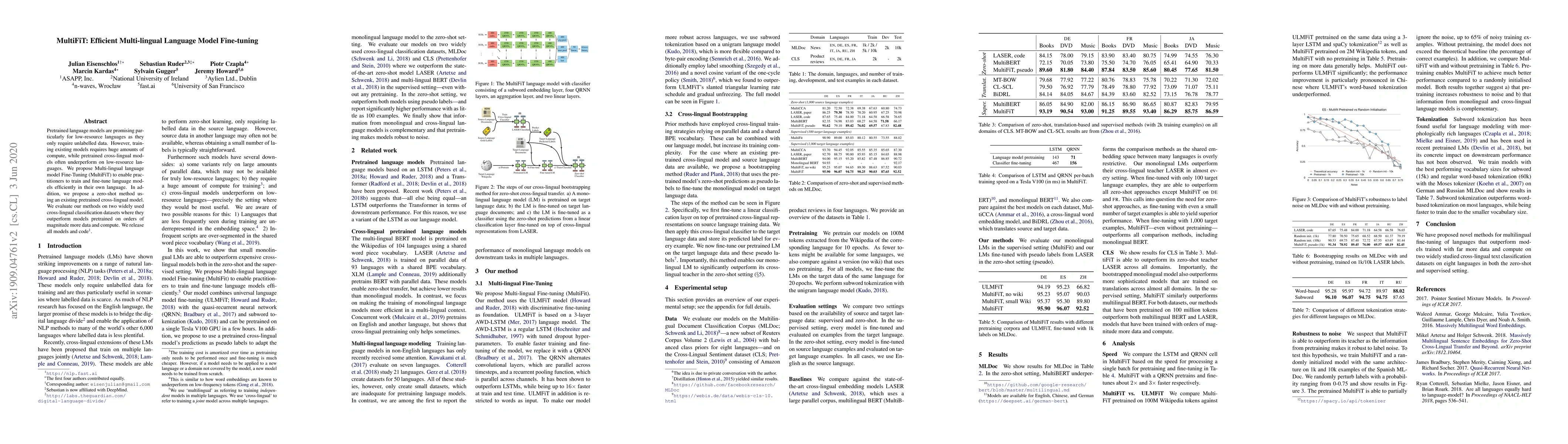 The paper introduces MultiFiT, an efficient method for fine-tuning multilingual language models to perform well on low-resource languages with minimal compute. It also proposes a zero-shot approach leveraging existing pretrained models, demonstrating superior performance on cross-lingual classification tasks compared to models trained on large datasets.