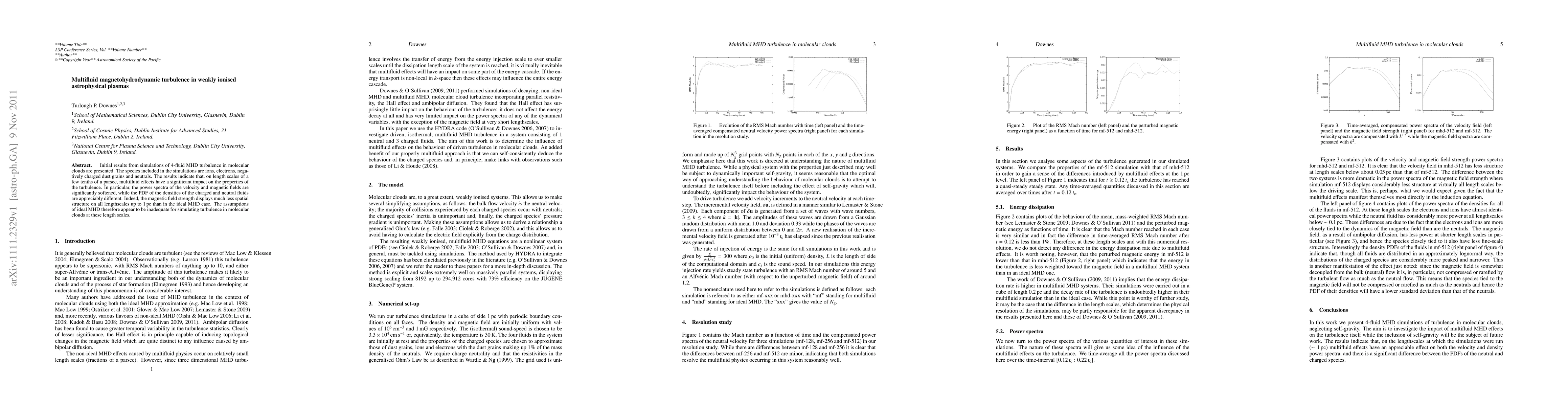 This paper presents initial results from simulations of 4-fluid magnetohydrodynamic (MHD) turbulence in molecular clouds, showing significant multifluid effects on turbulence properties at scales of a few tenths of a parsec. The simulations reveal softened power spectra and distinct probability density functions for charged and neutral fluids, indicating that ideal MHD assumptions are inadequate for these scales.
