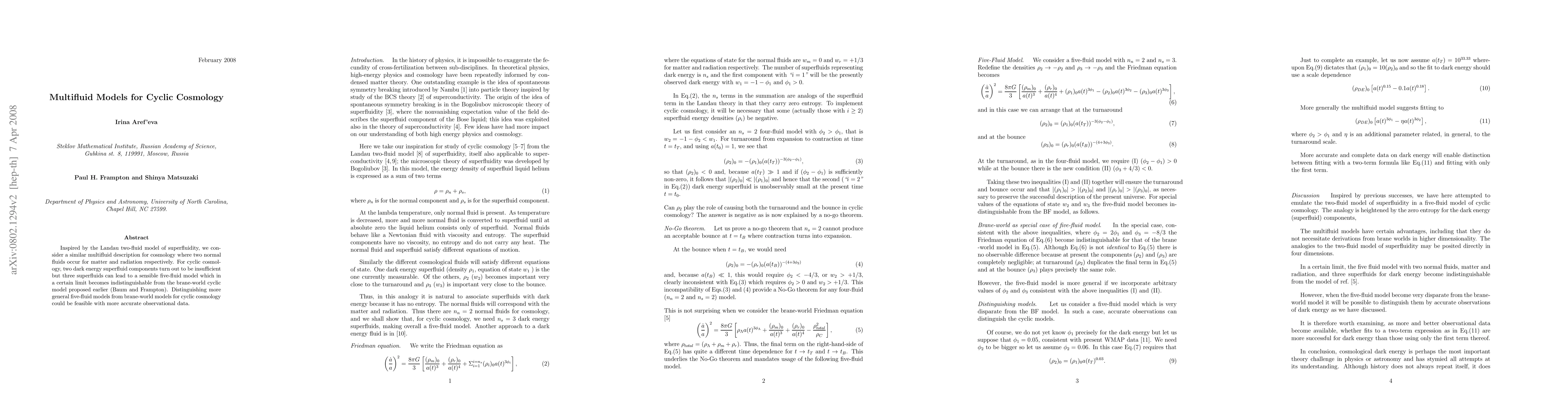 Inspired by the Landau two-fluid model of superfluidity, we consider a similar multifluid description for cosmology where two normal fluids occur for matter and radiation respectively. For cyclic cosmology, two dark energy superfluid components turn out to be insufficient but three superfluids can lead to a sensible five-fluid model which in a certain limit becomes indistinguishable from the brane-world cyclic model proposed earlier (Baum and Frampton). Distinguishing more general five-fluid models from brane-world models for cyclic cosmology could be feasible with more accurate observational data.