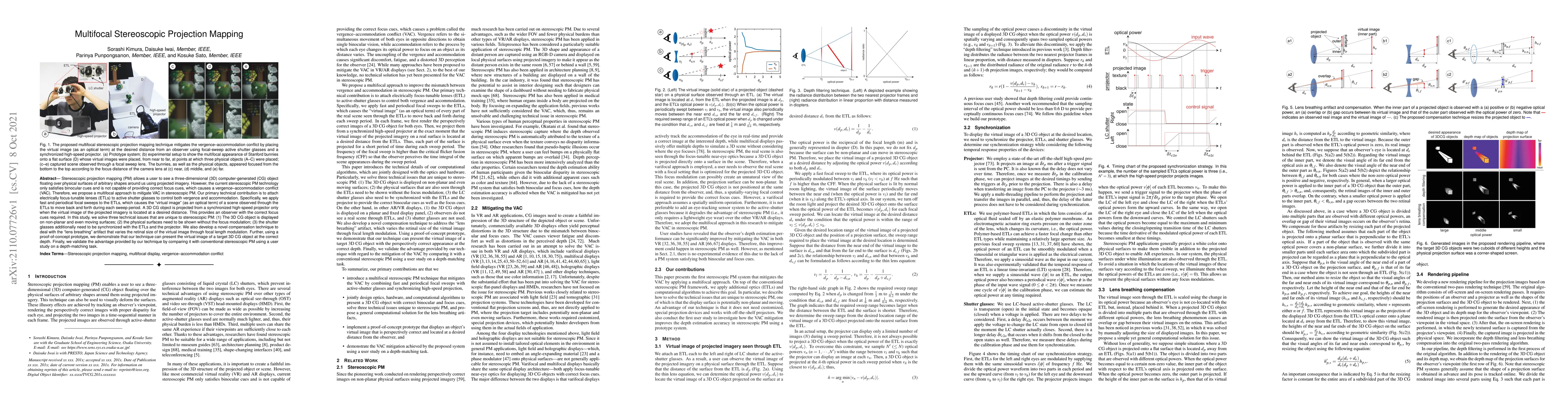 This paper proposes a multifocal stereoscopic projection mapping technique to mitigate vergence-accommodation conflict by using electrically focus-tunable lenses attached to active shutter glasses. The method addresses challenges in displaying 3D CG objects on non-planar surfaces and compensates for lens breathing artifacts, demonstrating improved focus cues through a prototype and user study.