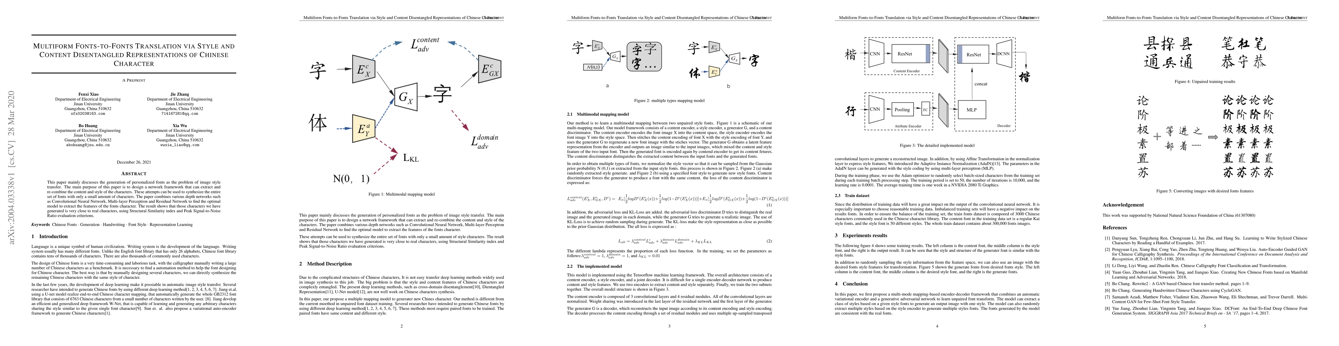 This paper proposes a network framework for translating fonts by disentangling style and content in Chinese characters, achieving personalized font generation through style transfer. The model combines Convolutional Neural Networks, Multi-layer Perceptrons, and Residual Networks, demonstrating high-quality font synthesis with strong Structural Similarity and Peak Signal-to-Noise Ratio metrics.