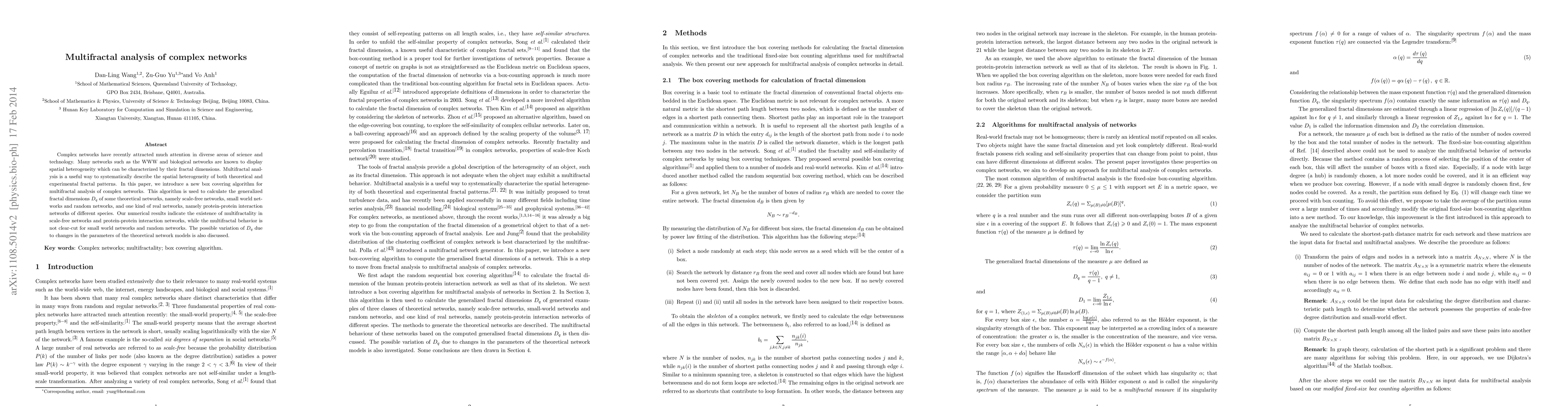 This paper introduces a new box covering algorithm for multifractal analysis of complex networks, applying it to theoretical and real networks to reveal multifractality in scale-free and protein-protein interaction networks, while less clear results are found for small world and random networks. The study also explores how changes in network parameters affect generalized fractal dimensions.