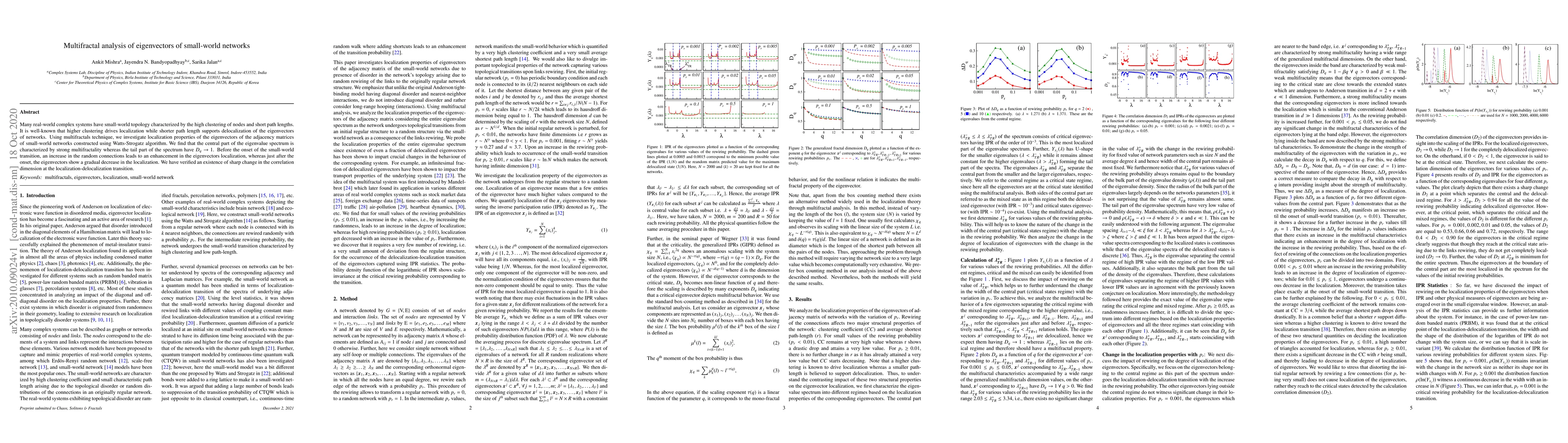 The research employs multifractal analysis of eigenvectors of small-world networks constructed via the Watts-Strogatz algorithm. It investigates localization properties of adjacency matrices using the IPR and correlation dimension, Dq, to understand the impact of rewiring probability on eigenvector localization.