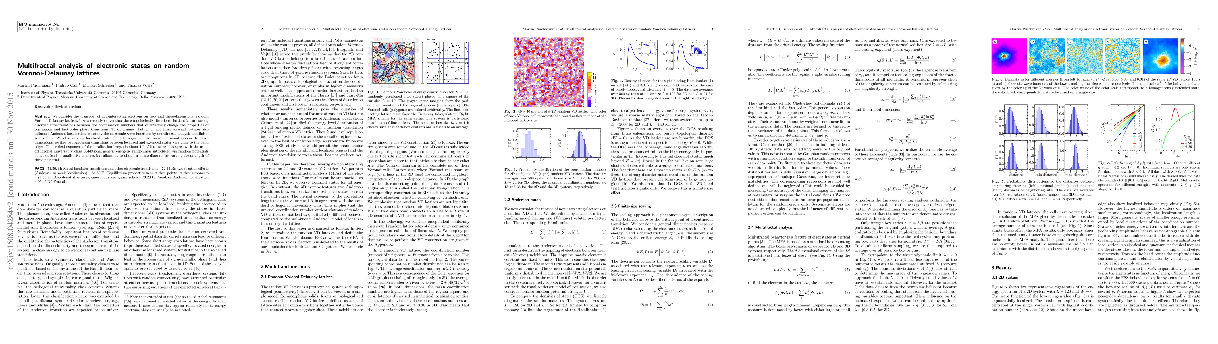 This paper investigates the electronic states on random Voronoi-Delaunay lattices using multifractal analysis, revealing localized states in two dimensions and two Anderson transitions in three dimensions near band edges. The study confirms the usual orthogonal universality class and provides a phase diagram with varying potential strengths.