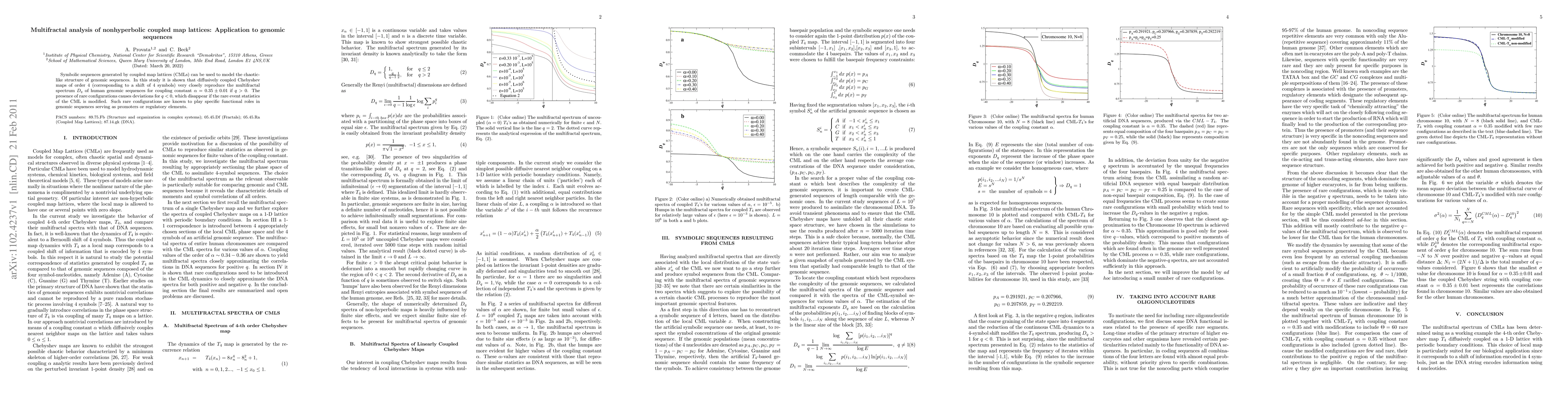 Symbolic sequences generated by coupled map lattices (CMLs) can be used to model the chaotic-like structure of genomic sequences. In this study it is shown that diffusively coupled Chebyshev maps of order 4 (corresponding to a shift of 4 symbols) very closely reproduce the multifractal spectrum $D_q$ of human genomic sequences for coupling constant $\alpha =0.35\pm 0.01$ if $q>0$. The presence of rare configurations causes deviations for $q<0$, which disappear if the rare event statistics of the CML is modified. Such rare configurations are known to play specific functional roles in genomic sequences serving as promoters or regulatory elements.
