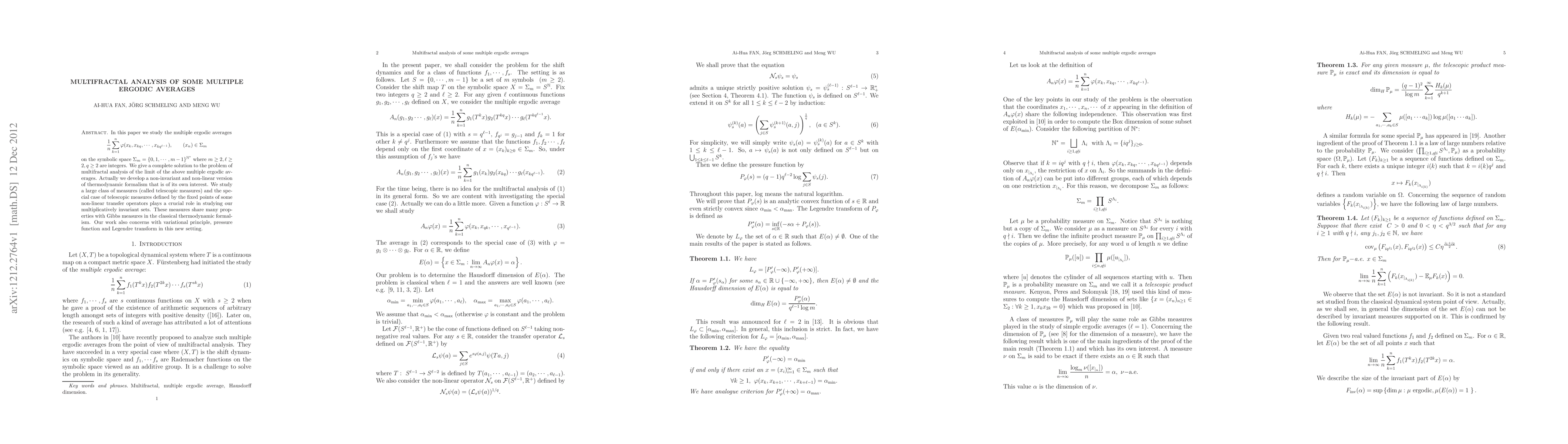 This paper explores the multifractal analysis of multiple ergodic averages on symbolic spaces, developing a new non-invariant and non-linear version of thermodynamic formalism. It focuses on telescopic measures and their properties, including variational principles and pressure functions, to study multiplicatively invariant sets.
