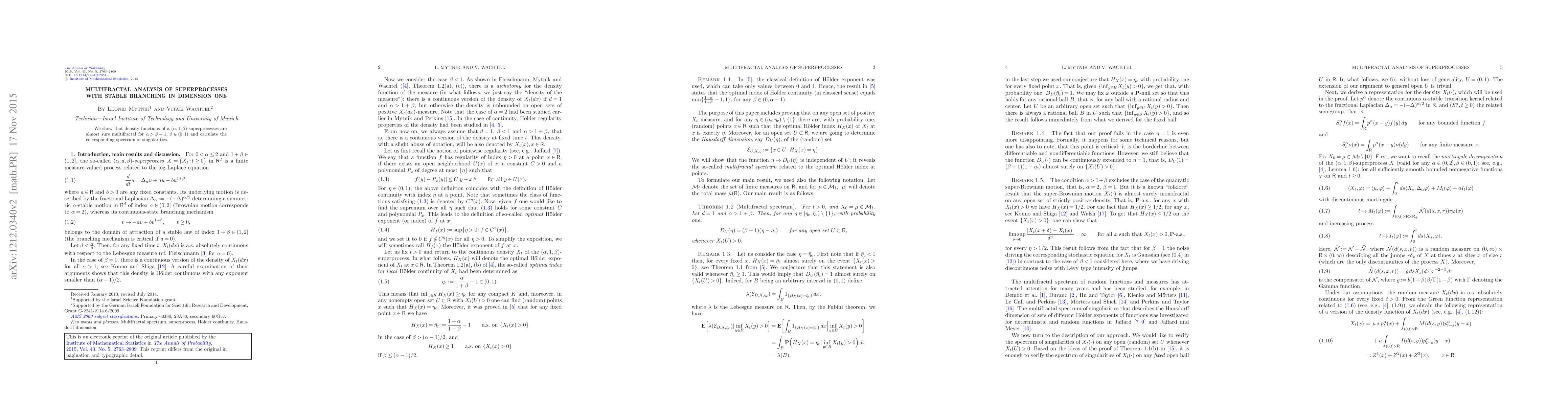 This research demonstrates that density functions of certain superprocesses in one dimension exhibit multifractal behavior when branching parameters satisfy u201calpha > u2113eta + 1, u2113eta u2264 1u2112u201d. The paper calculates the multifractal spectrum of singularities for these processes.