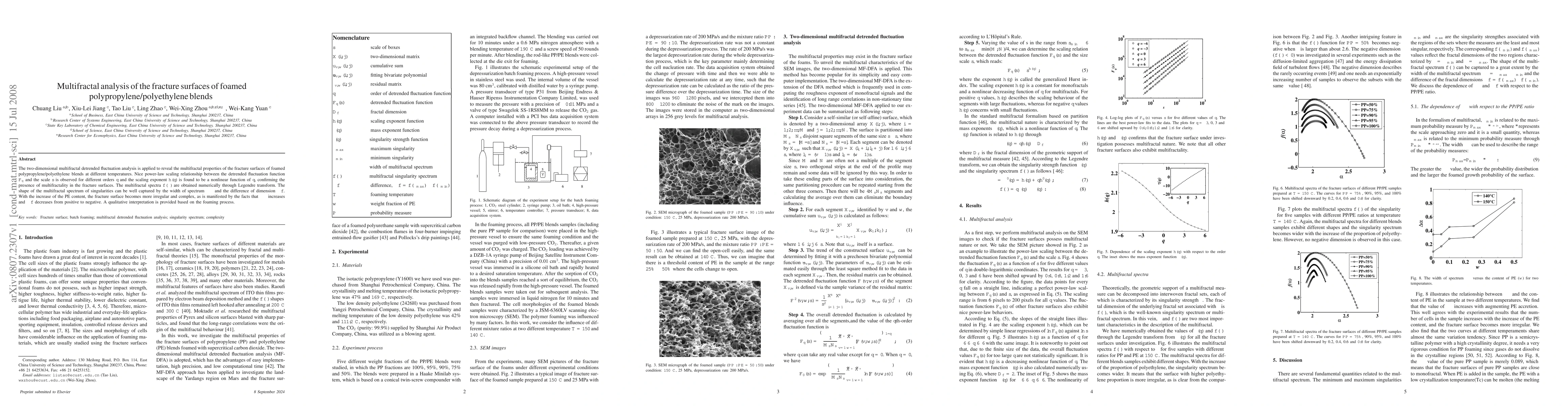 Researchers used multifractal analysis to study foamed polypropylene/polyethylene blends at different temperatures, finding that the fracture surfaces exhibit power-law scaling relationships and varying degrees of multifractality with increasing PE content.