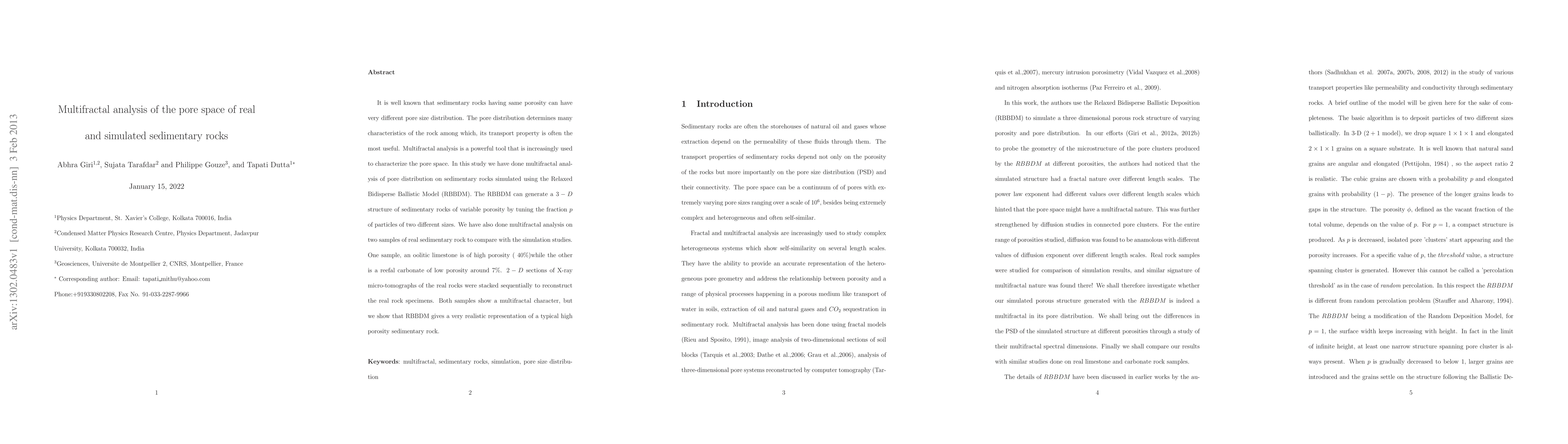 This paper uses multifractal analysis to compare the pore space distribution in real and simulated sedimentary rocks, demonstrating that the Relaxed Bidisperse Ballistic Model (RBBDM) realistically replicates high porosity rocks. Both real samples, an oolitic limestone and a reefal carbonate, show multifractal characteristics.