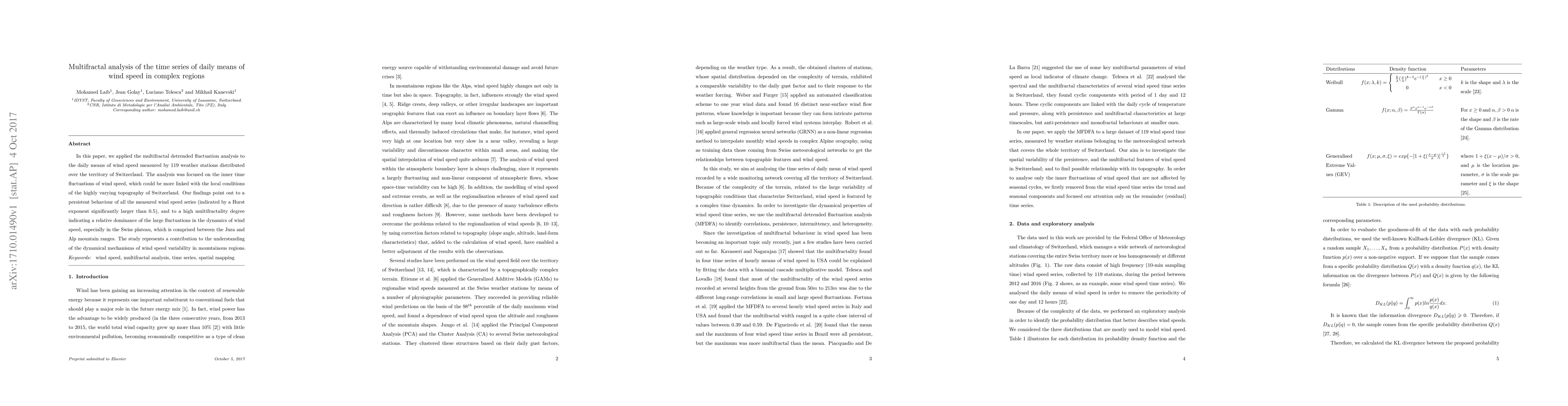 This paper uses multifractal detrended fluctuation analysis to study the daily wind speed means from 119 weather stations across Switzerland, revealing persistent behavior and high multifractality, especially in the Swiss plateau, indicating significant large fluctuations linked to local topography.