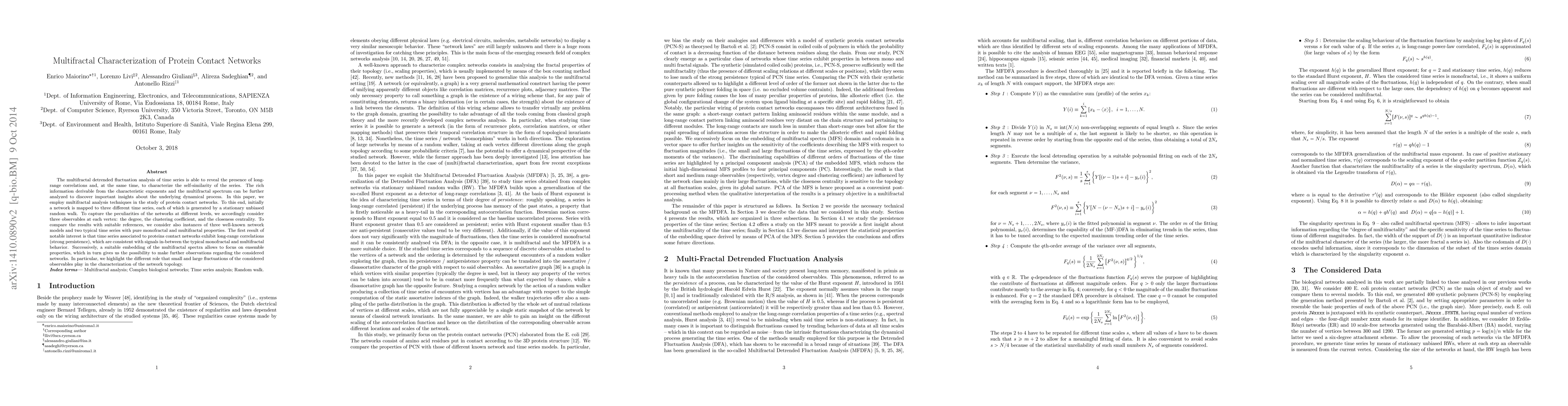 This paper uses multifractal analysis to study protein contact networks, revealing long-range correlations and self-similarity through time series derived from random walks. The study highlights the distinct roles of small and large fluctuations in the network's topology, distinguishing it from typical monofractal and multifractal behaviors.