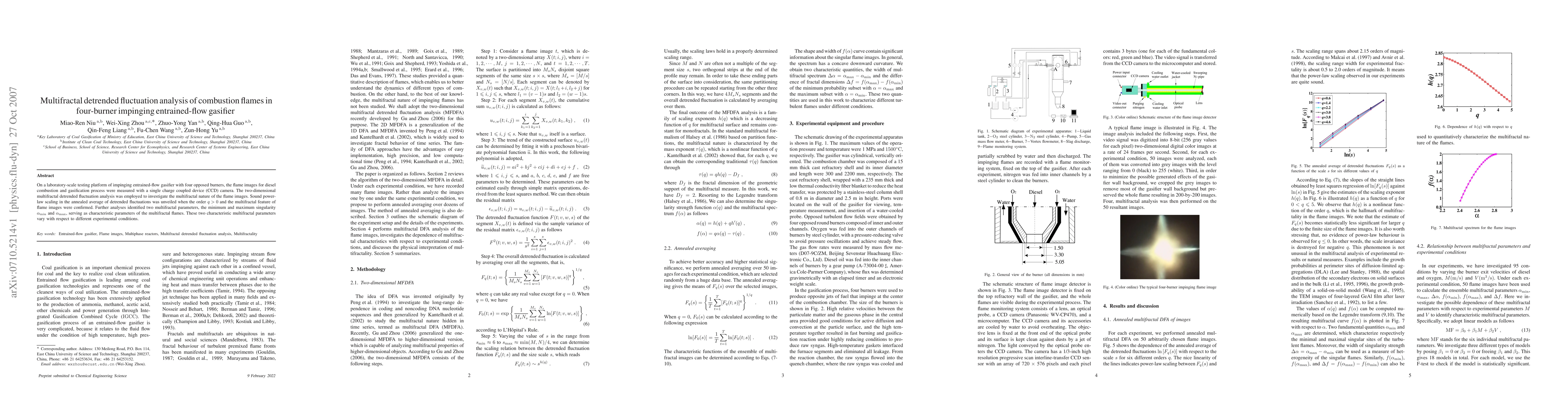 This paper uses multifractal detrended fluctuation analysis to study the complex dynamics of combustion flames in a four-burner impinging entrained-flow gasifier. The analysis reveals power-law scaling and identifies minimum and maximum singularity parameters as key characteristics of the flame's multifractal nature, which vary with different experimental conditions.