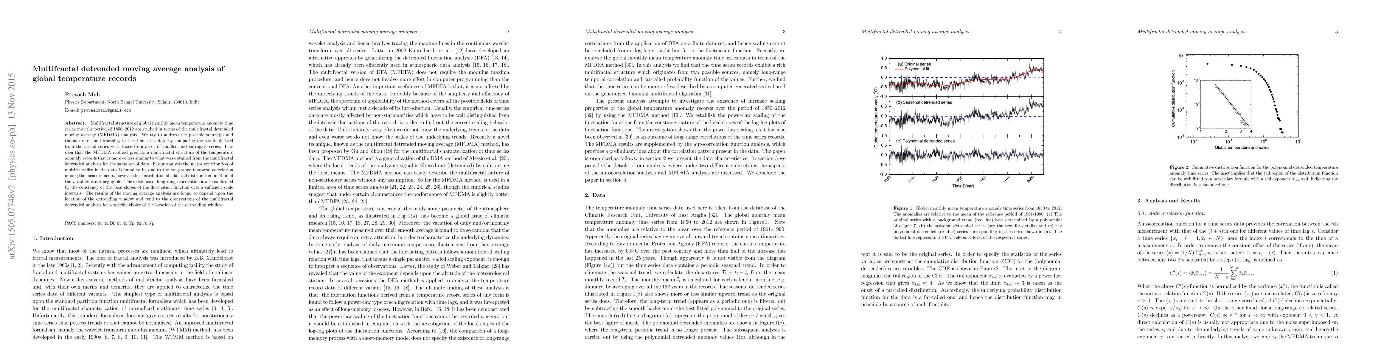 This study employs multifractal detrended moving average (MFDMA) analysis to investigate the multifractal structure of global monthly mean temperature anomalies from 1850-2012. The analysis reveals long-range temporal correlations as the primary source of multifractality, with a notable contribution from the fat-tail distribution, confirming the presence of such correlations through the constancy of local slopes in the fluctuation function.