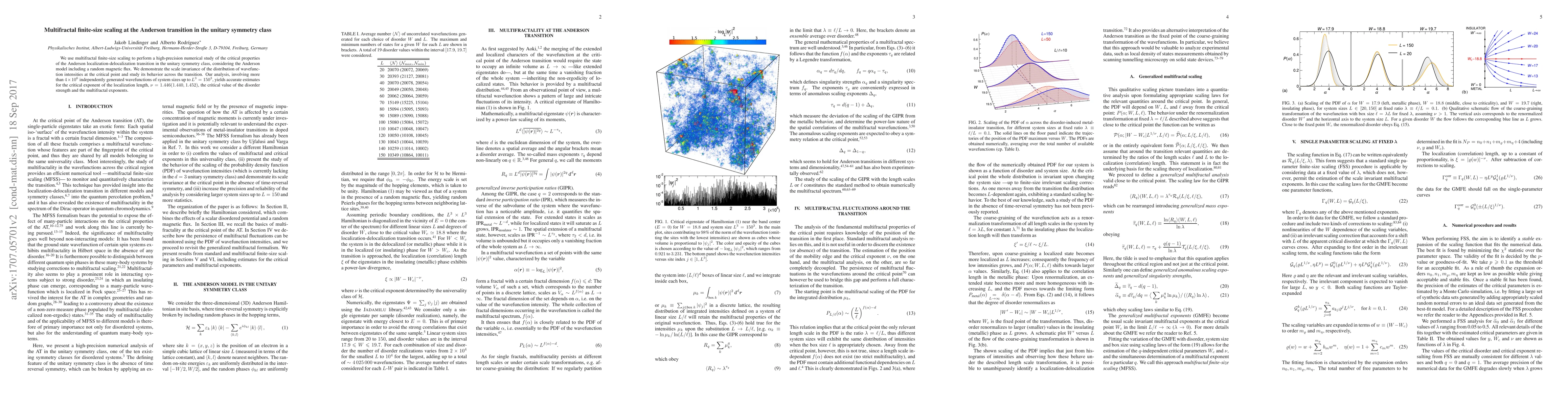 This paper employs multifractal finite-size scaling to investigate the critical behavior of the Anderson transition in the unitary symmetry class, revealing scale invariance in wavefunction intensity distribution at the critical point. The study provides precise estimates for critical exponents and disorder strength using extensive numerical simulations.